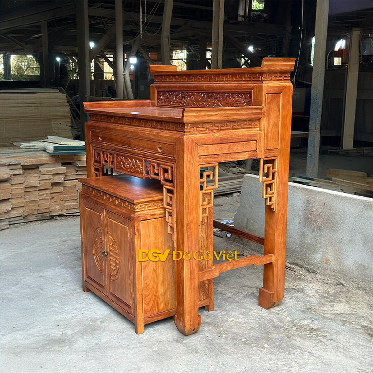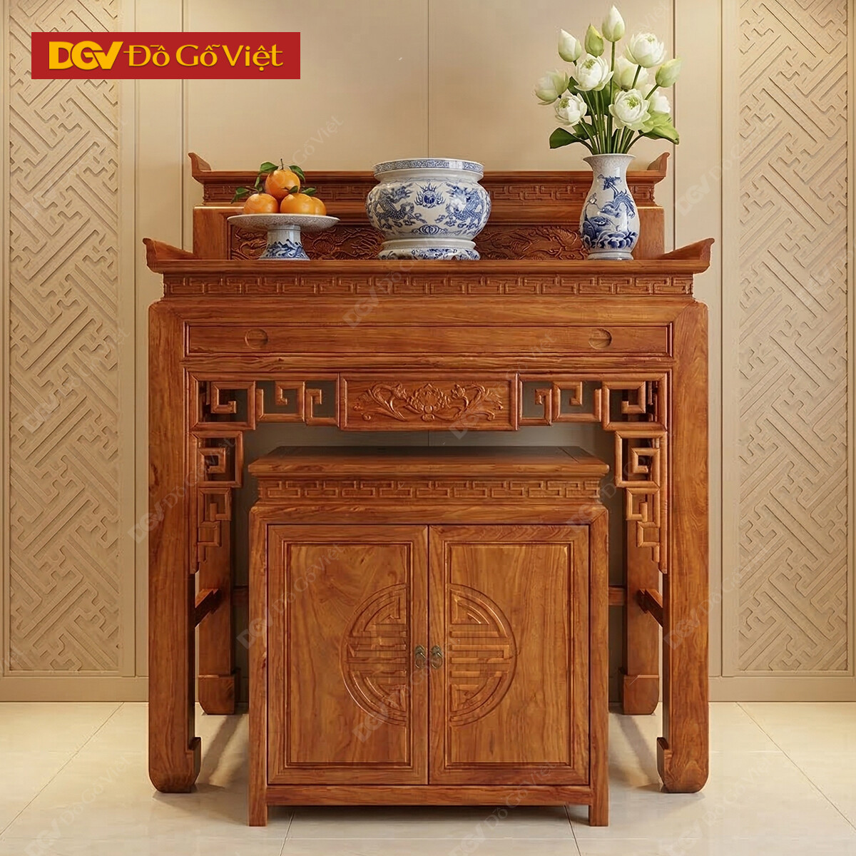 Án Gian Thờ Gỗ Gõ Đỏ Cao Cấp 1m75 Chạm Sen Kèm Tủ Táp