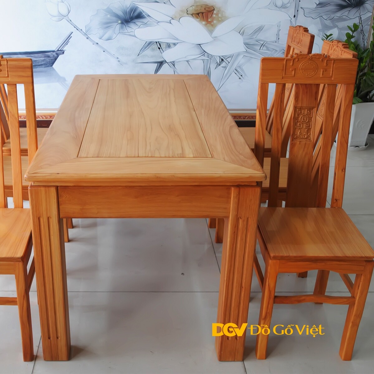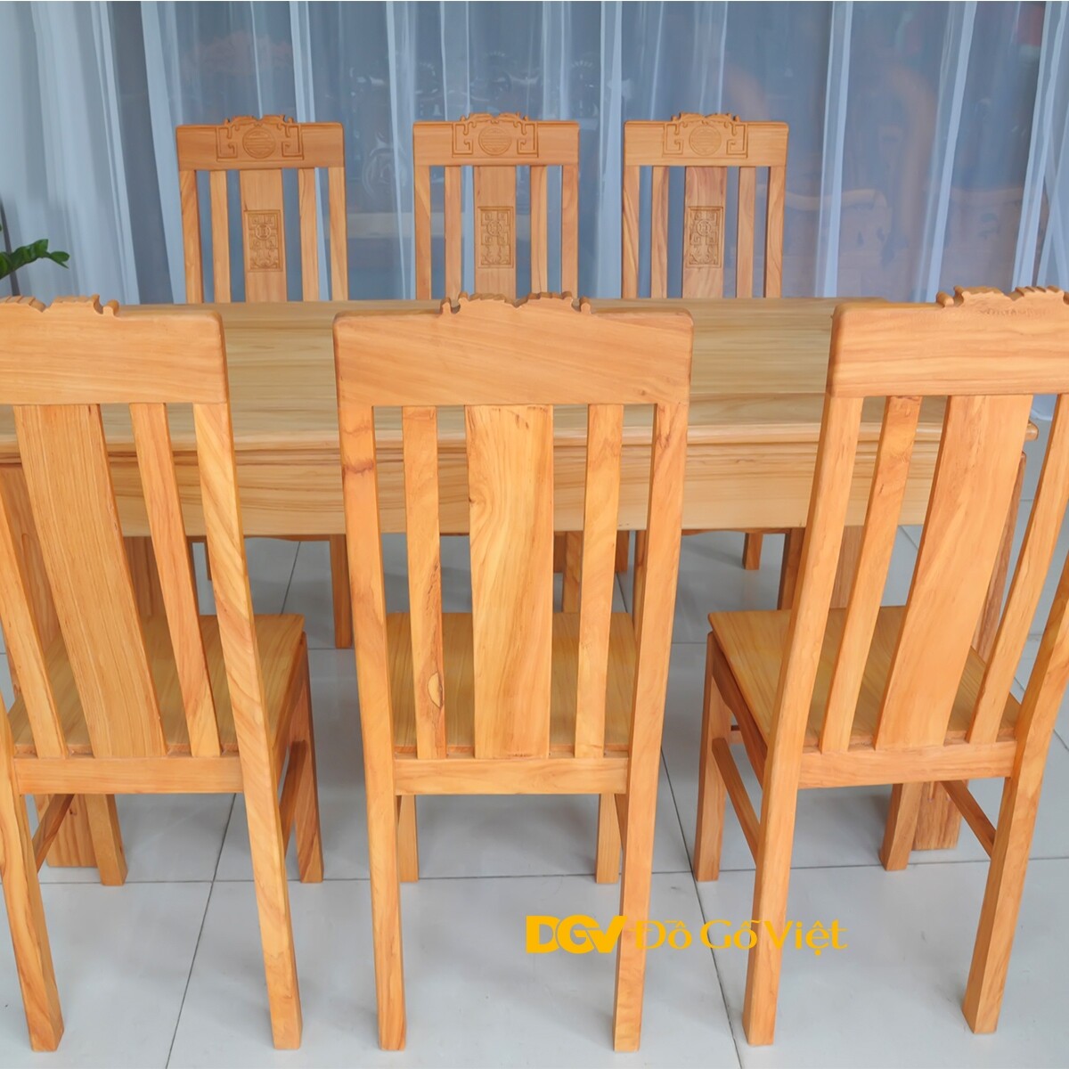 Bàn Ăn Căm Xe Mặt Gõ Chữ Nhật Cong 1m9 8 Ghế