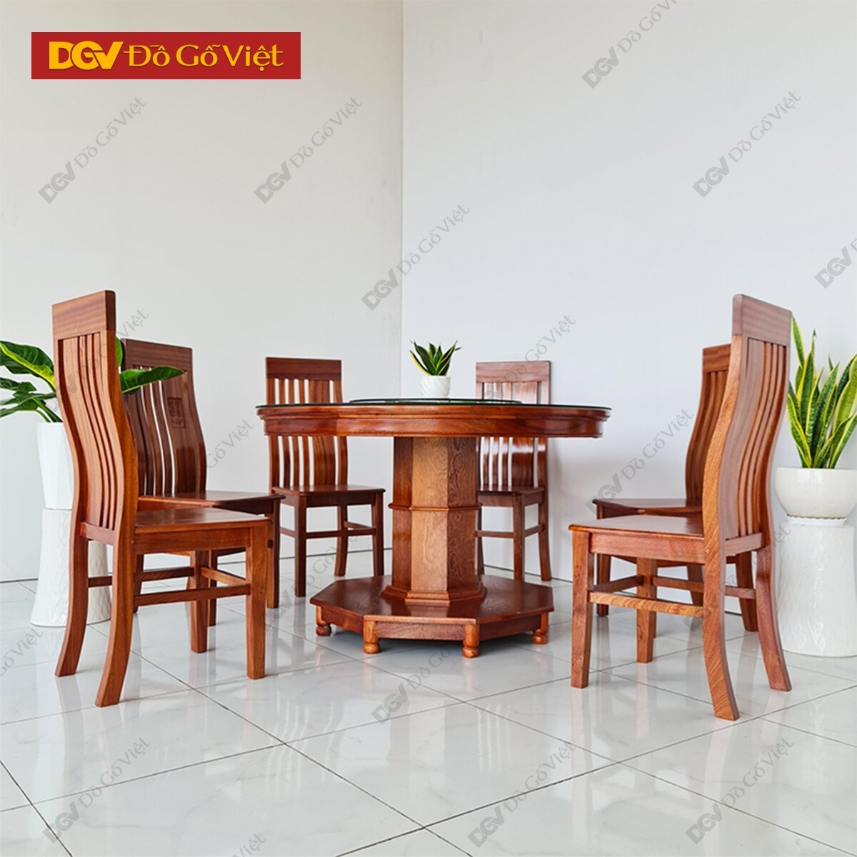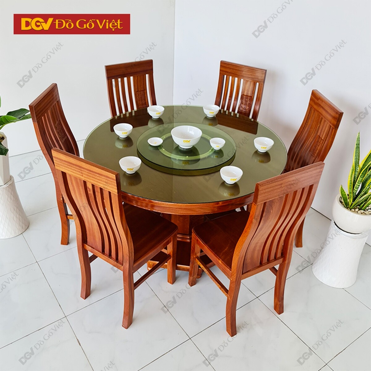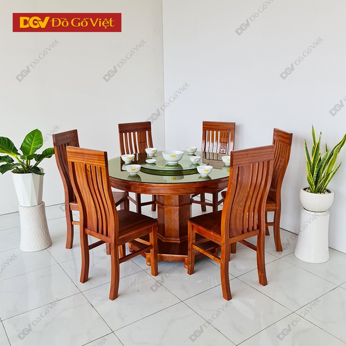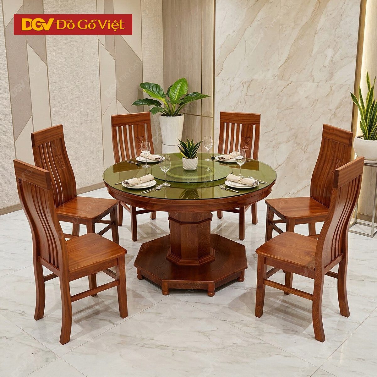 Bàn Ăn Tròn Mâm Xoay Gỗ Xoan Đào 6 Ghế