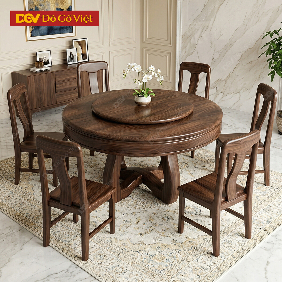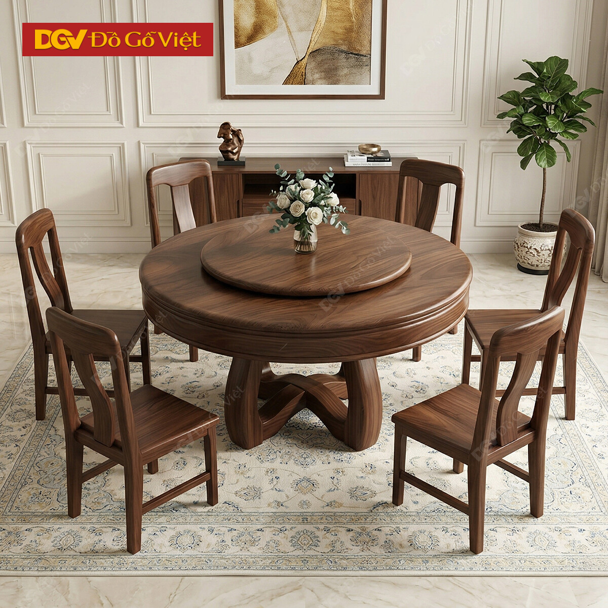 Bàn Ghế Ăn Gỗ Óc Chó Chân Chữ X Thiết Kế Mâm Xoay Tiện Nghi