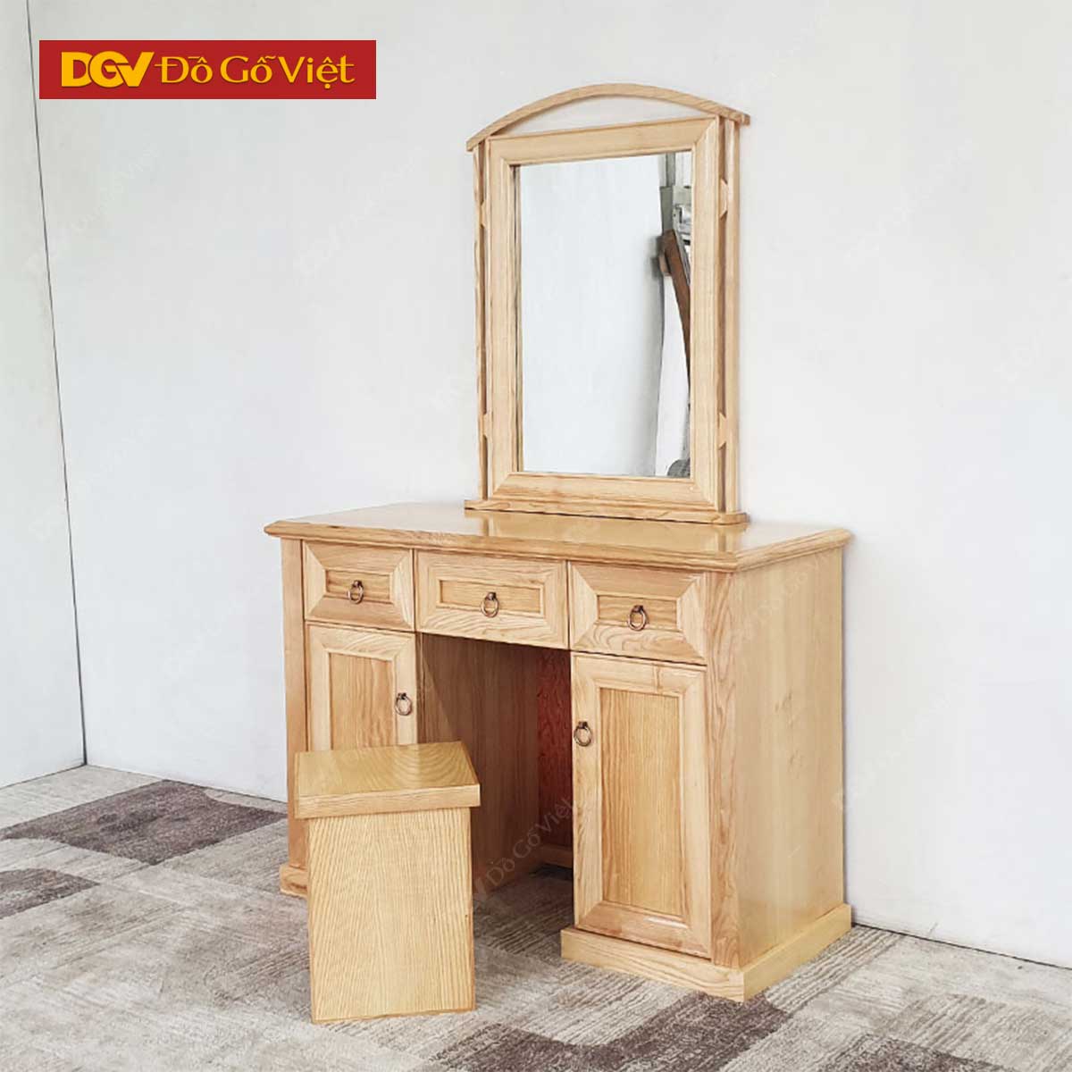 Bàn trang điểm chất liệu gỗ tự nhiên được thiết kế đối xứng với 3 hộc tủ ngang cùng hai ngăn tủ lớn ở hai bên vô cùng rộng rãi, bạn có thể thoải mái bảo quản, cất giữ mỹ phẩm, trang sức cũng như túi xách … ở đây.