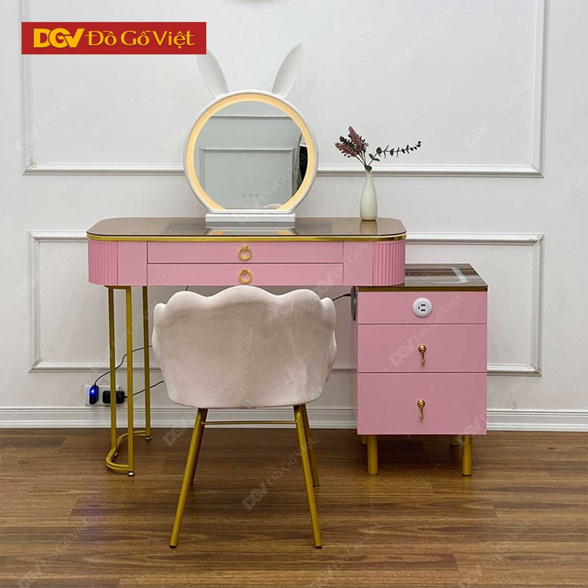 Bàn Phấn Trang Điểm Màu Hồng Gương Tròn Tai Thỏ Dễ Thương