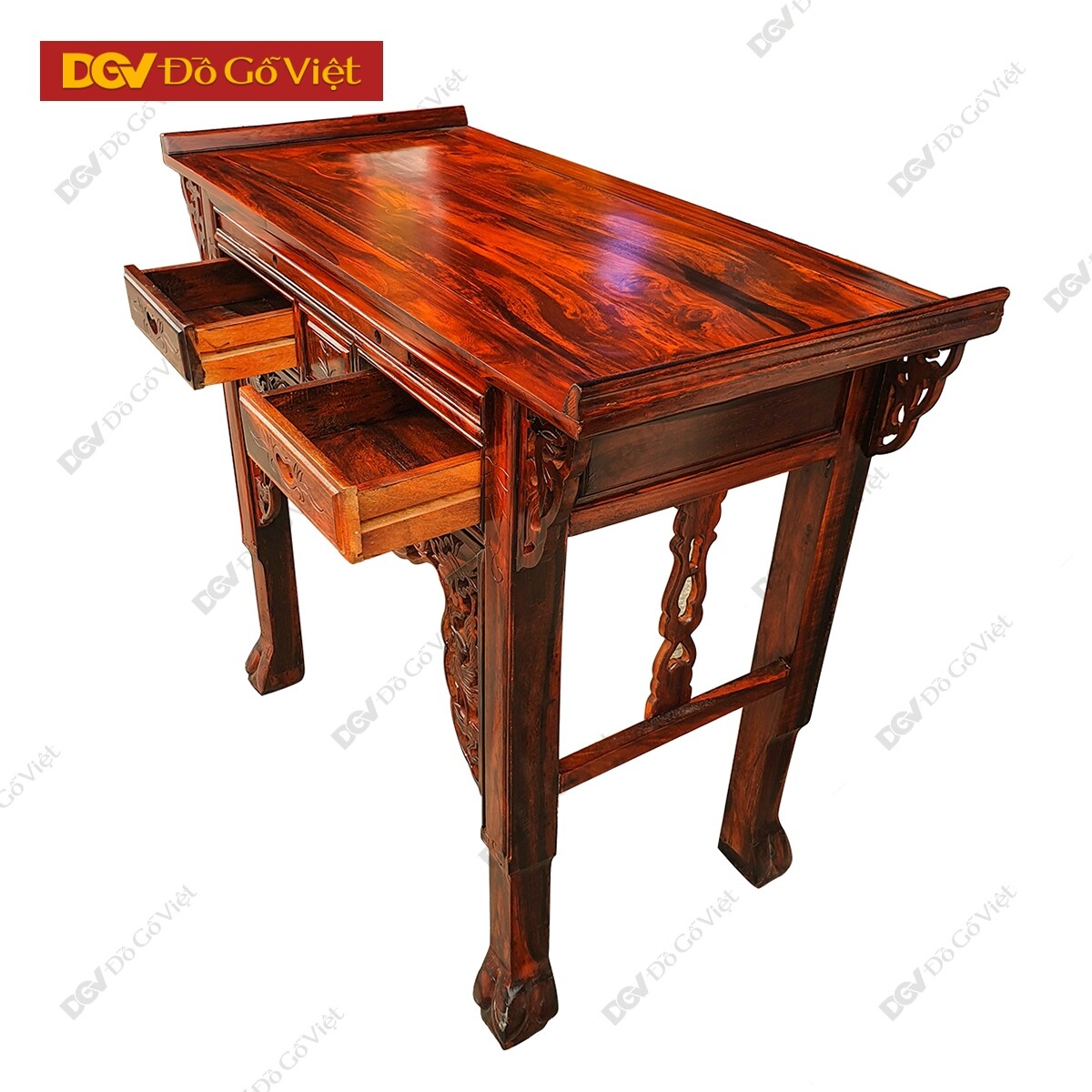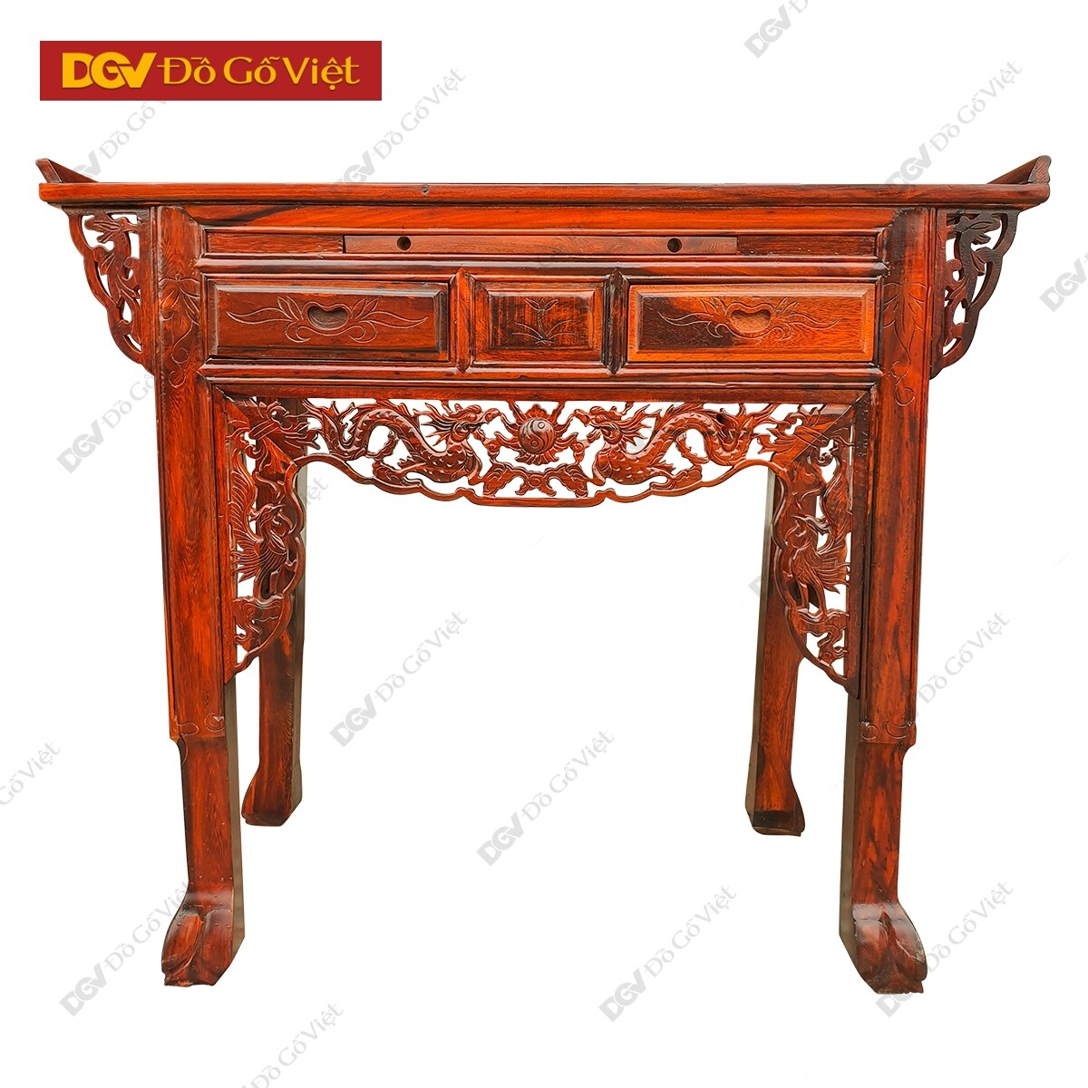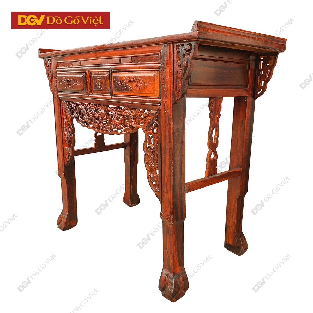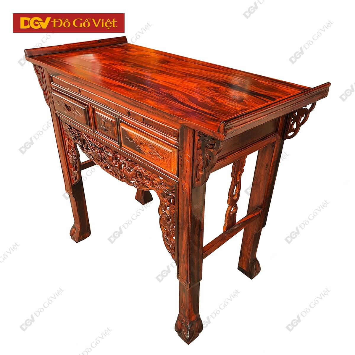 Bàn thờ gỗ muồng giá tốt được hoàn thiện với tổng thể hình khối vuông vức, bốn chân trụ được phân bố đồng đều ở các bên tạo nên sự cân bằng đem lại chắc chắn cho bàn thờ. Hoa văn chân rùa tinh tế mang theo ý nghĩa về sự trường thọ, vững chãi trong công việc cuộc sống.