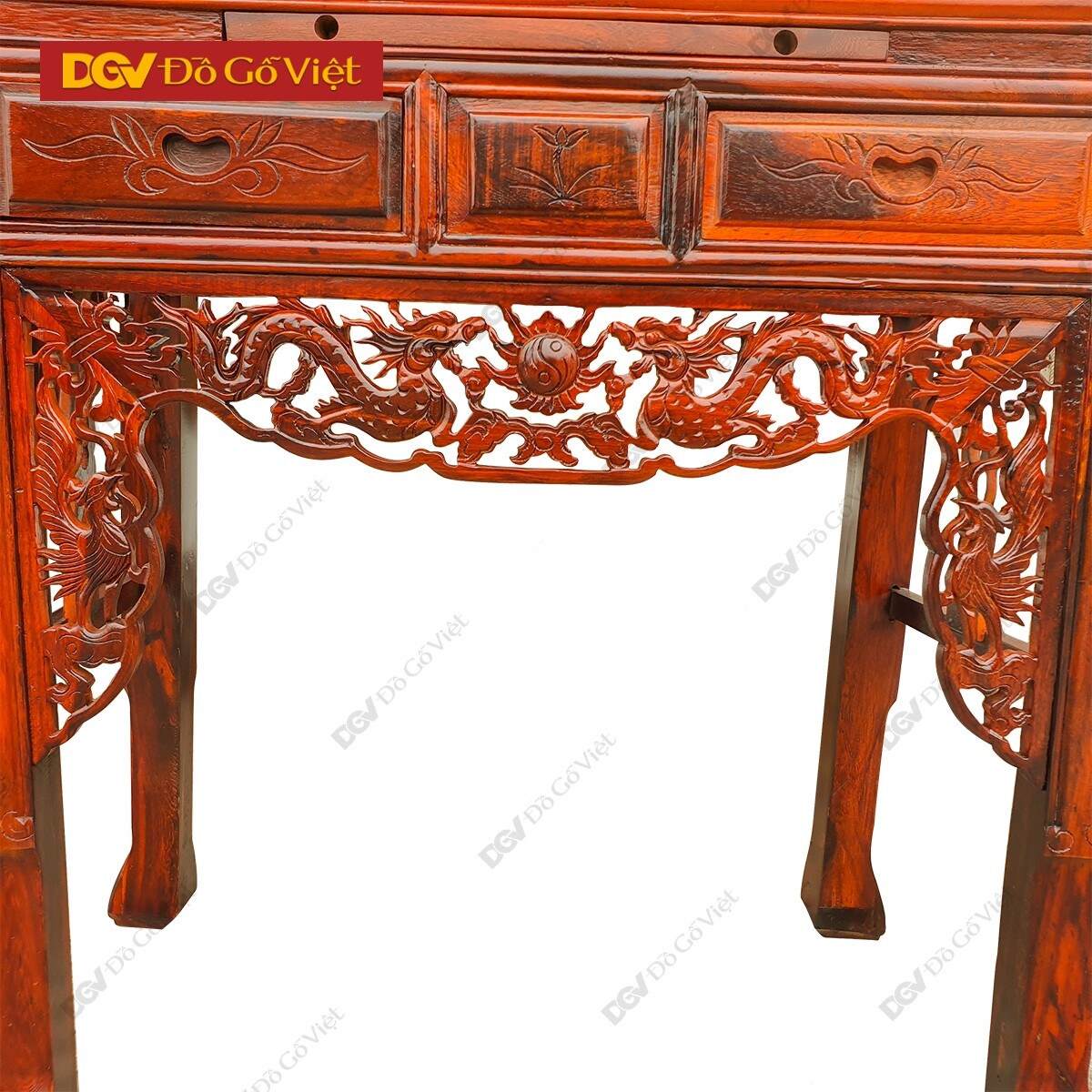 Các chi tiết như mặt bàn thờ, chân trụ đều được làm từ gỗ nguyên khối nâng cao độ chịu lực của sản phẩm, giúp bạn có thể an tâm trong quá trình bày trí các vật phẩm thờ cúng theo ý muốn.