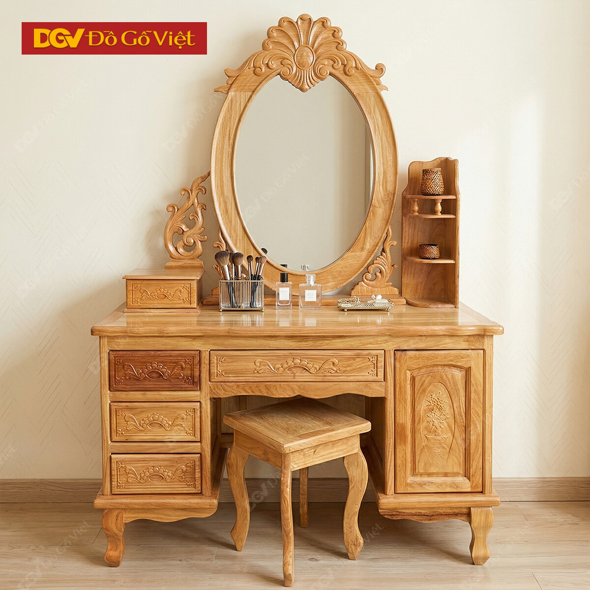 Bàn Trang Điểm Gõ Đỏ 80cm Chạm Hoa Hồng Kèm Hộc Kệ Rẻ Đẹp