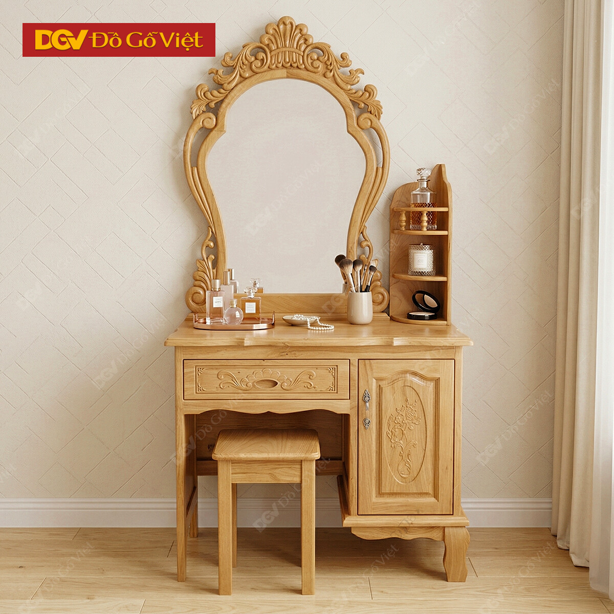 Bàn Trang Điểm Gõ Đỏ 80cm Chạm Hoa Hồng Kèm Hộc Kệ Rẻ Đẹp