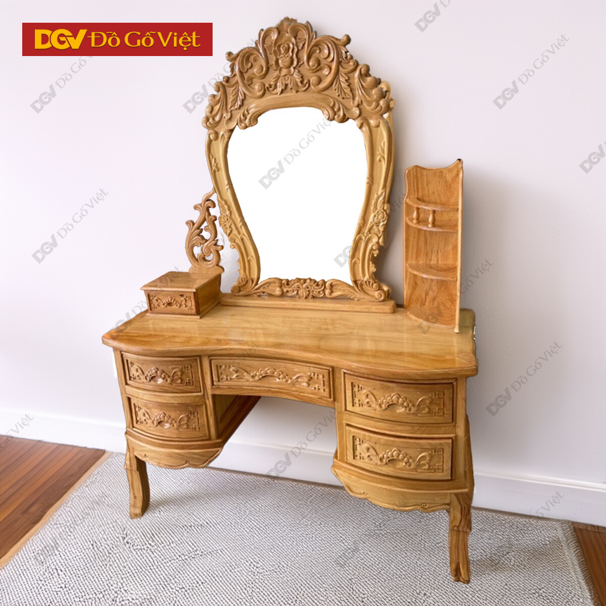 Bàn Trang Điểm Gỗ Gõ Đỏ Mẫu Cong Kèm Họa Tiết Hoa Hồng