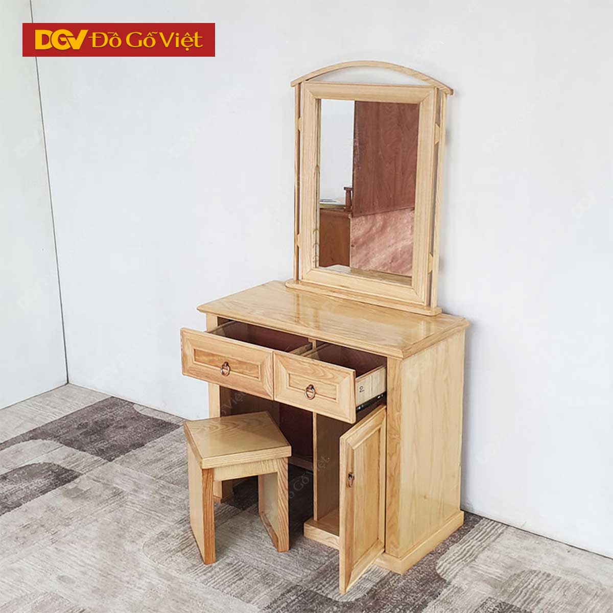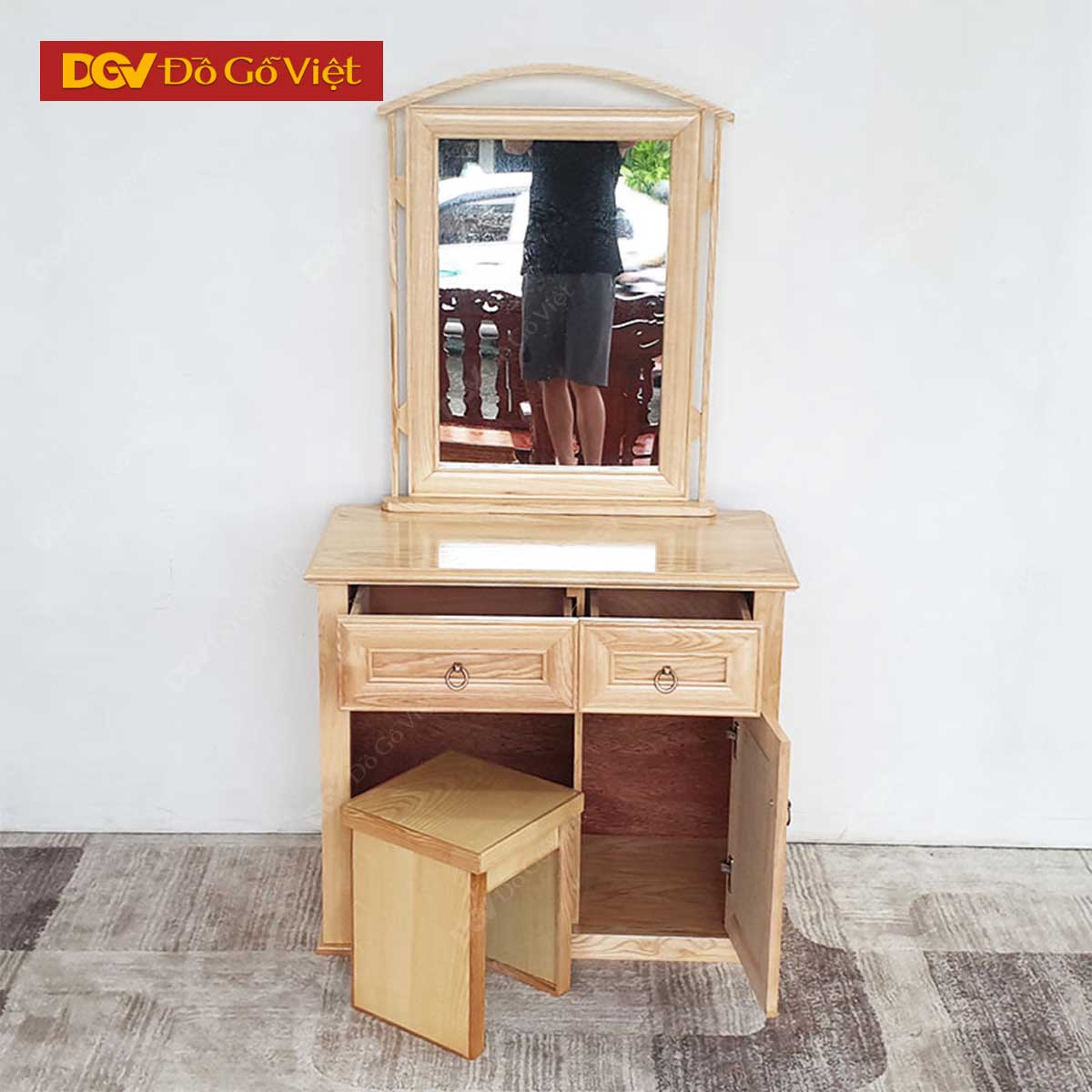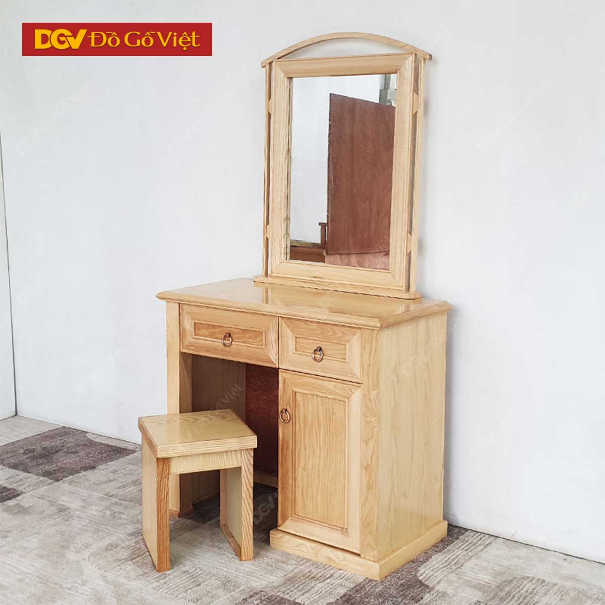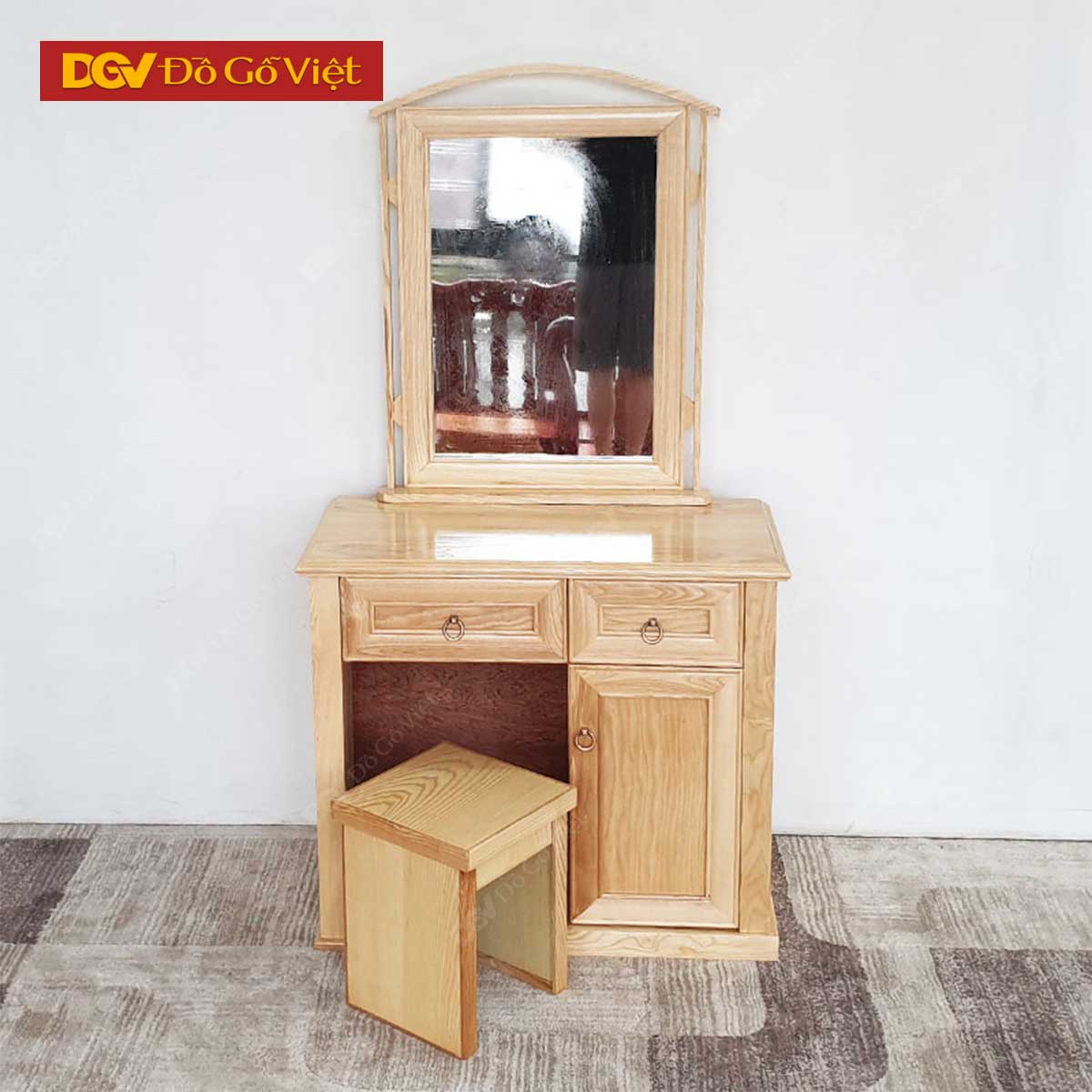 Bàn trang điểm đi kèm ghế ngồi với các kích thước tiêu chuẩn phù hợp với hầu hết không gian phòng ngủ hiện nay. Các chi tiết thiết kế, bề mặt phủ sơn bóng có khả năng chống trầy xước, chống ẩm, dễ dàng vệ sinh và nâng cao tuổi thọ sản phẩm nhiều hơn. Thiết kế gọn nhẹ phù hợp với những không gian vừa và nhỏ góp phần tối ưu không gian sống cho gia đình.