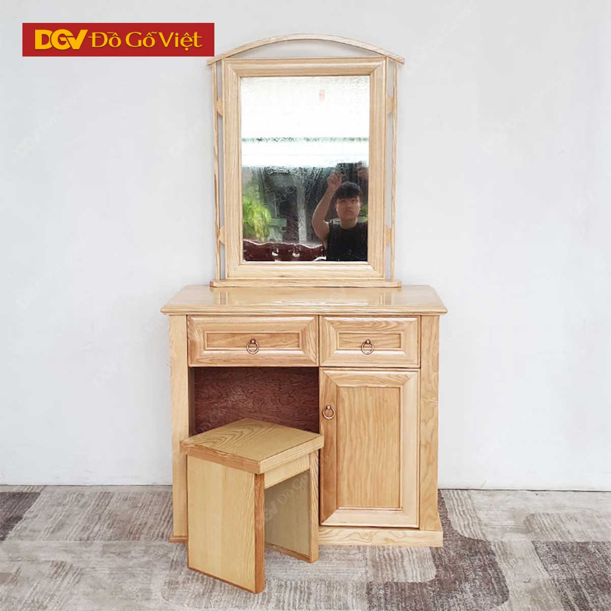 Bàn trang điểm sồi sử dụng mặt gương soi có hình dáng chữ nhật đứng. Mặt gương được đặt cân đối, vững chãi, giúp bạn dễ dàng thao tác hơn trong suốt quá trình trang điểm. Kích thước gương lớn đem lại trải nghiệm sử dụng tốt nhất cho người dùng.