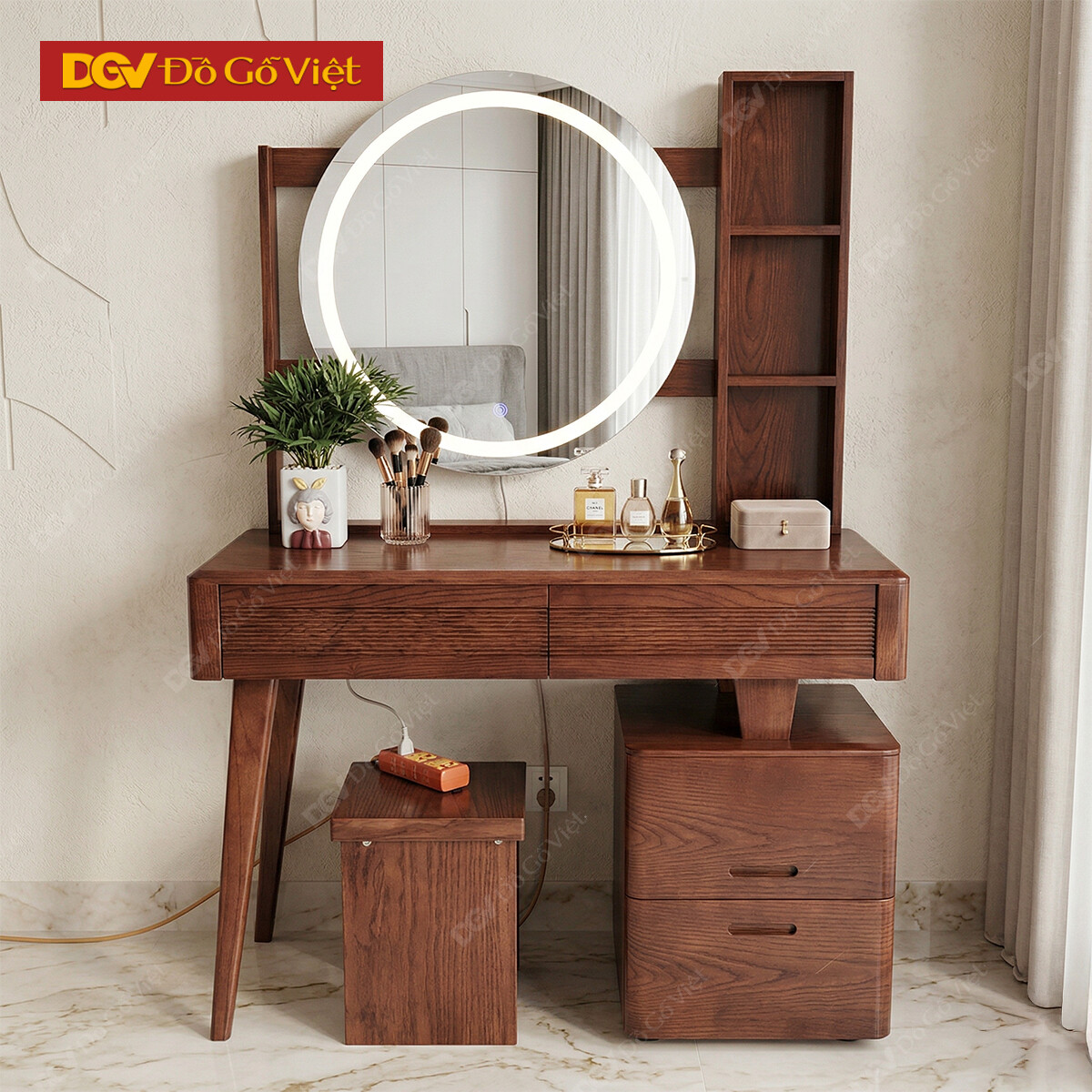 Bàn Trang Điểm Gương Tròn Gỗ Sồi Màu Nâu Óc Chó Đẹp