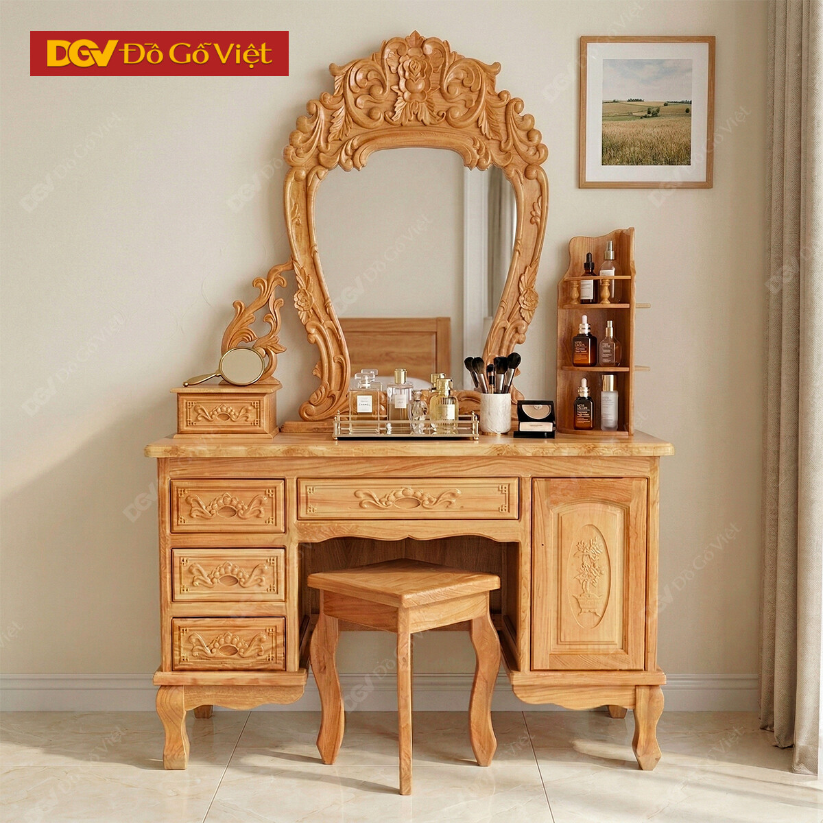Bàn Trang Điểm Gõ Đỏ 80cm Chạm Hoa Hồng Kèm Hộc Kệ Rẻ Đẹp