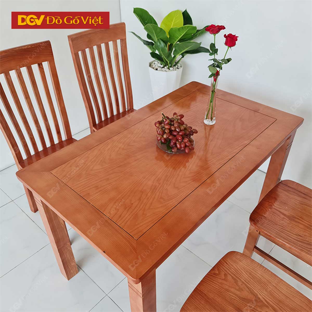 • Mặt bàn làm kiểu pano với 2 tấm gỗ ghép lại với nhau, hạn chế tình trang nứt viền, nứt cạnh như loại bàn liền truyền thống. Bàn ăn đi kèm với tấm kính mặt bàn giúp bảo vệ mặt bàn tốt, dễ dàng vệ sinh, lau chùi sau khi sử dụng.