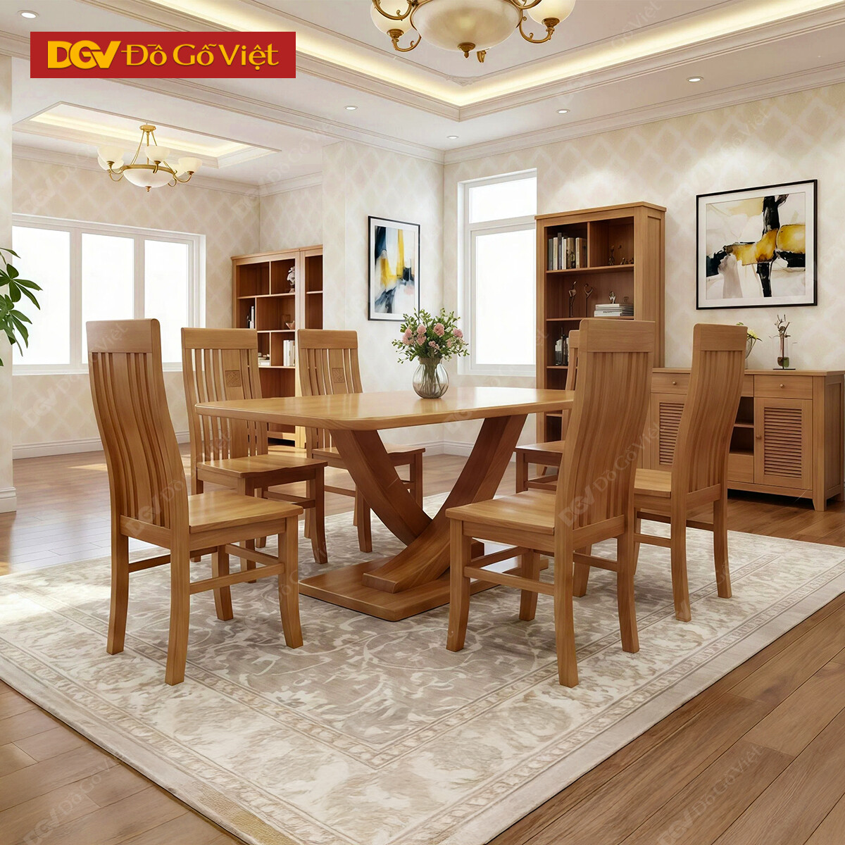 Bộ Bàn Ăn Chân Trụ Chéo 6 Ghế Nan Lệch Màu Nâu Bền Đẹp Giá Tốt