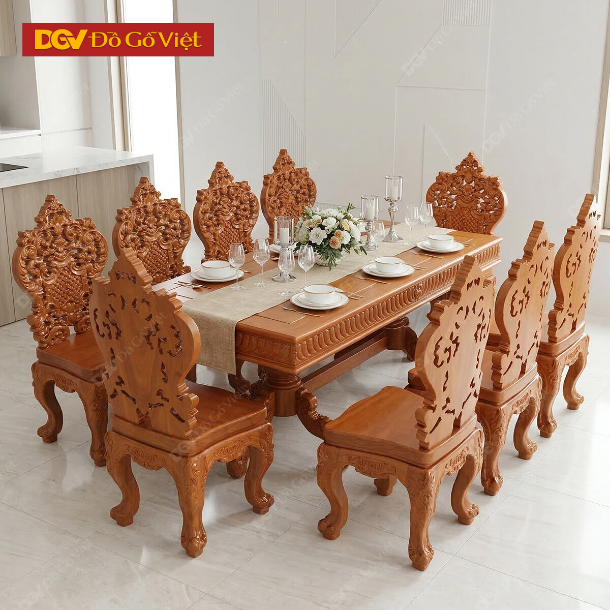 Bàn Ăn Căm Xe Mặt Gõ Chữ Nhật Cong 1m9 8 Ghế