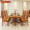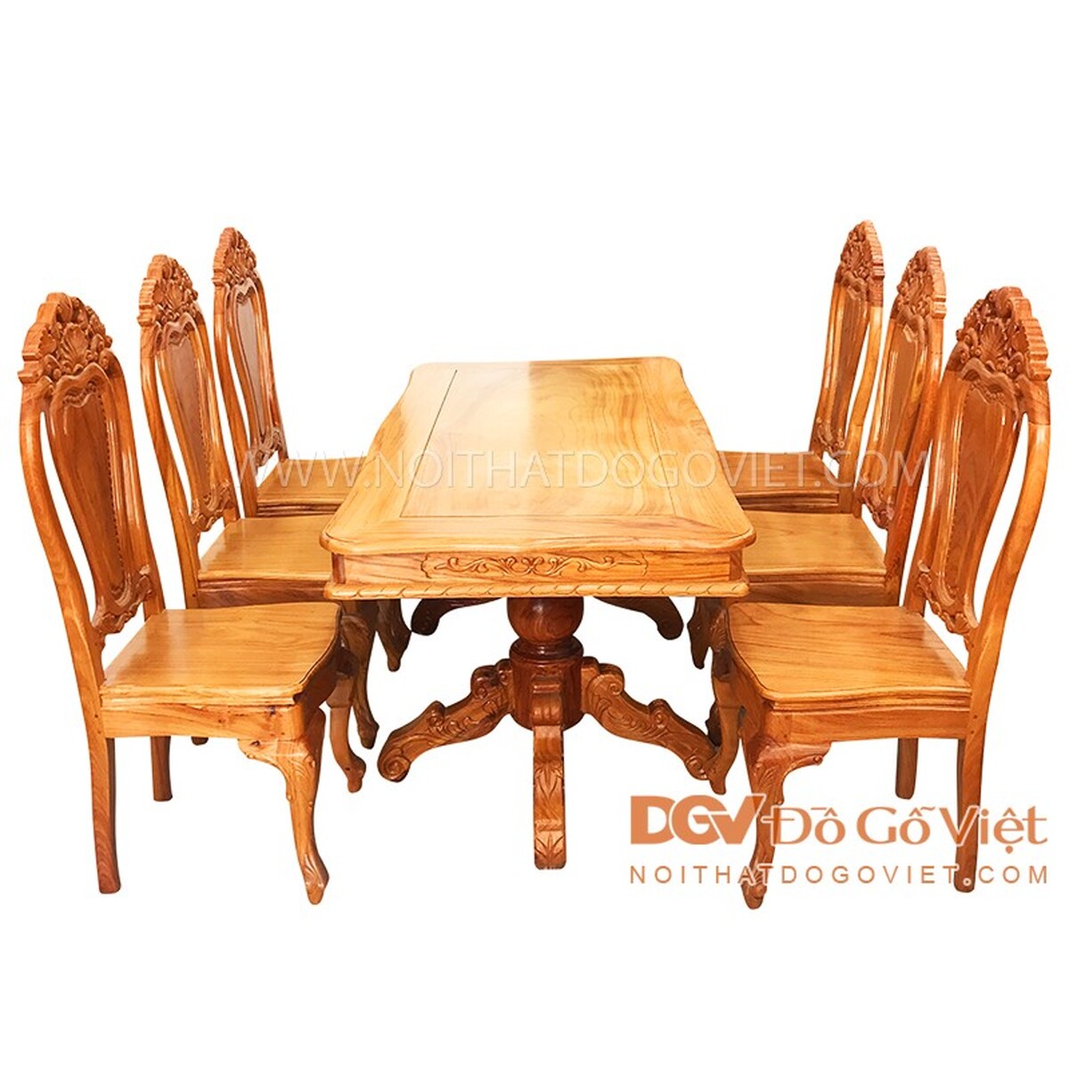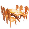Bộ bàn ăn 6 ghế gõ đỏ được thiết kế hình chữ nhật vuông, cạnh bàn được làm mềm với những đường cong uốn lượn nhẹ nhàng cùng những hoa văn cách điệu khá đẹp mắt. Mặt bàn được lựa chọn từ tấm gỗ lớn với những đường vân gỗ đẹp nhất, màu sắc đặc trưng đậm chất riêng của nội thất làm từ gỗ gõ đỏ.