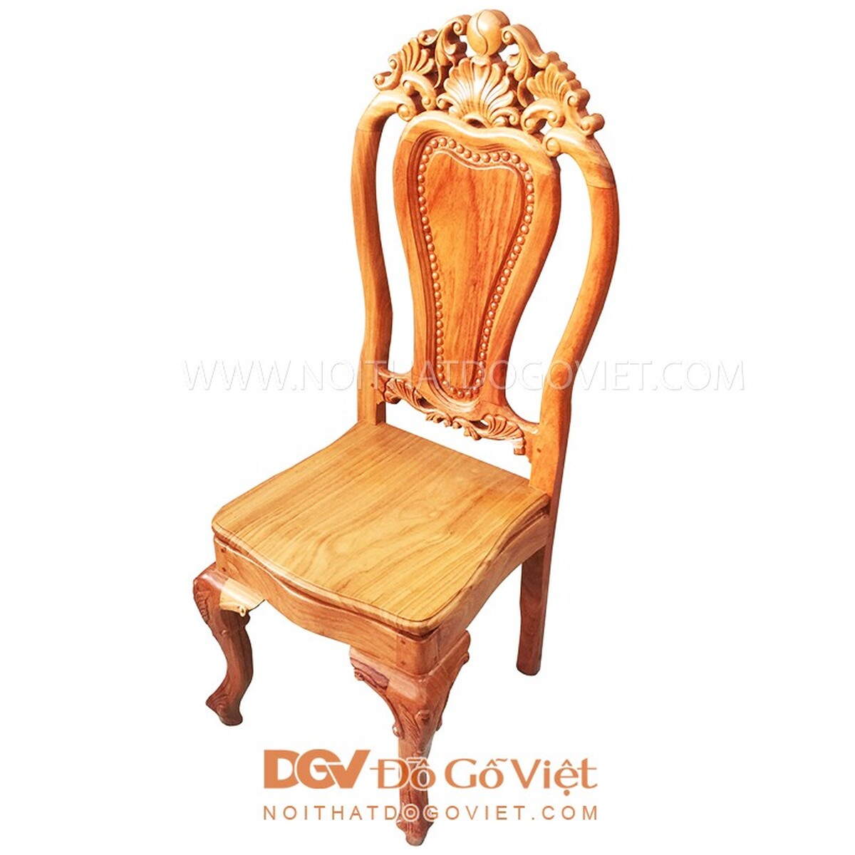Ghế ngồi thiết kế kiểu lưng cong cổ điển, đỉnh ghế chạm họa tiết hoa tây kết hợp với họa tiết lưỡng nghi khá độc đáo. Lưng ghế kiểu bảng lớn chạm họa tiết tràng hạt đơn giản, chân ghế hơi cong nhẹ chạm họa tiết hoa nở khá đẹp mắt.