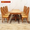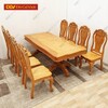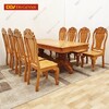 Bàn ăn gỗ gõ đỏ 8 ghế được thiết kế hình chữ nhật với bề mặt bàn rộng 90cm, 4 góc bàn vuông góc với nhau giúp mở rộng tối đa diện tích không gian sử dụng. Viền bàn làm kiểu lượn sóng với những hoa văn cuộn chạm nổi tinh tế. Góp phần làm mềm đi thiết kế bàn ăn hình chữ nhật, loại bỏ cảm giác thô cứng của sản phẩm làm từ chất liệu gỗ tự nhiên.