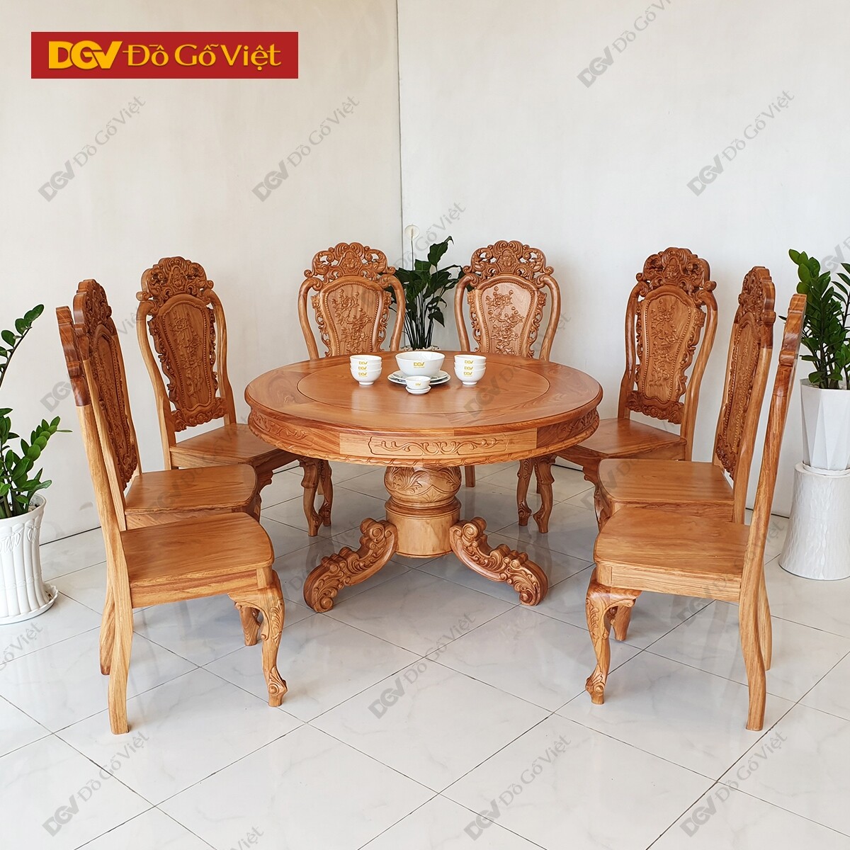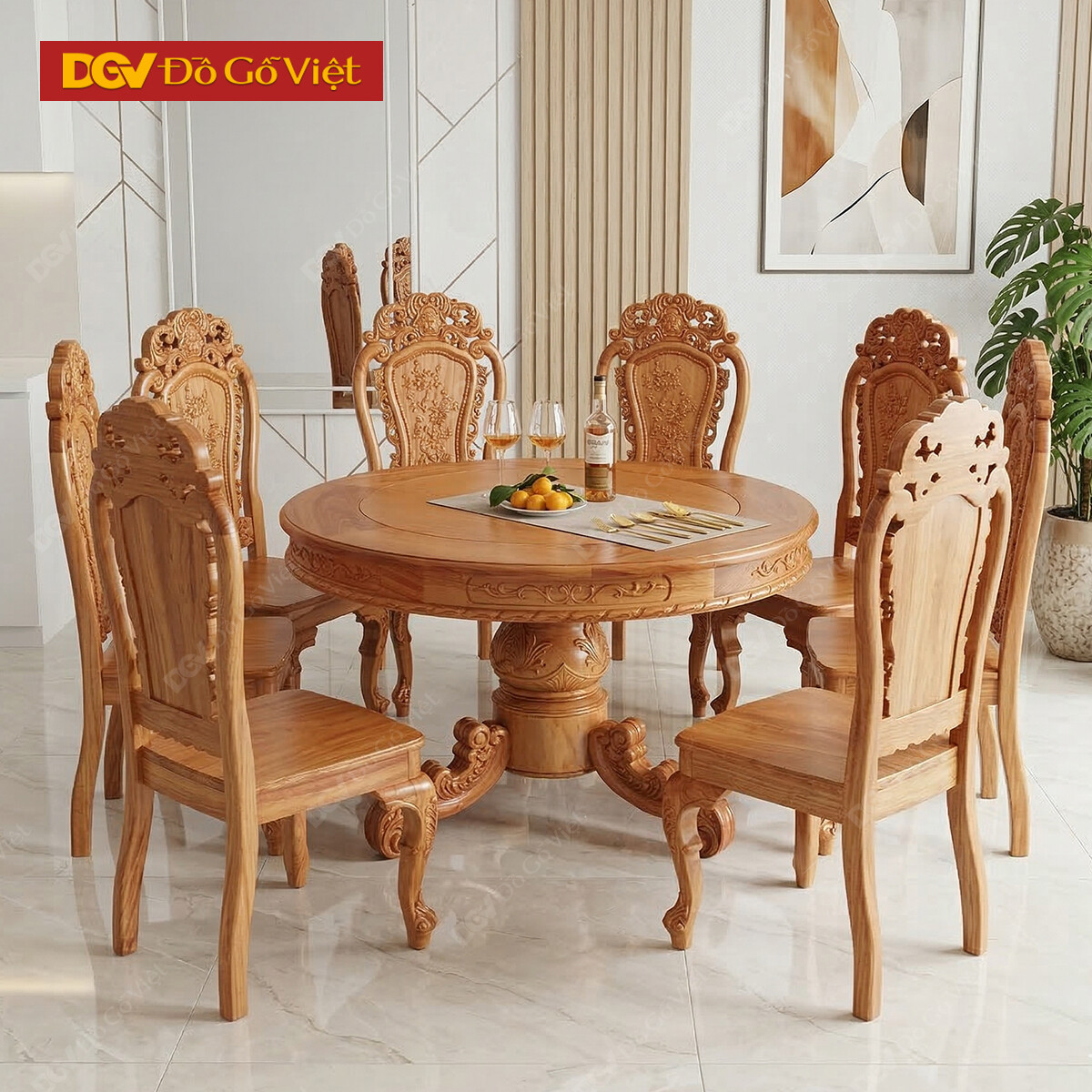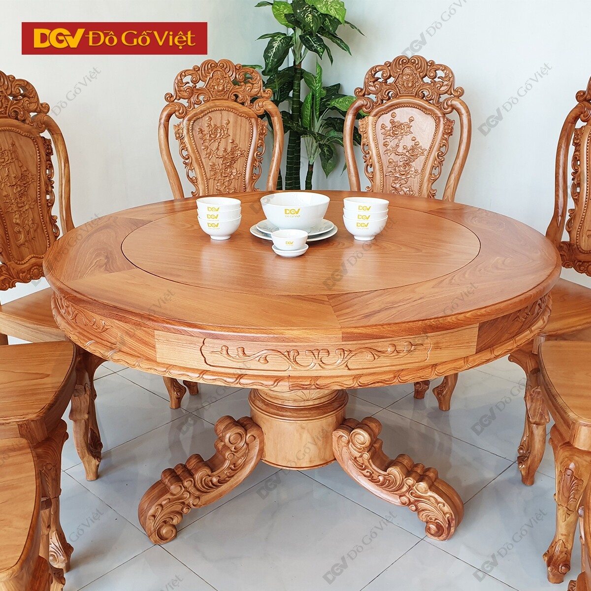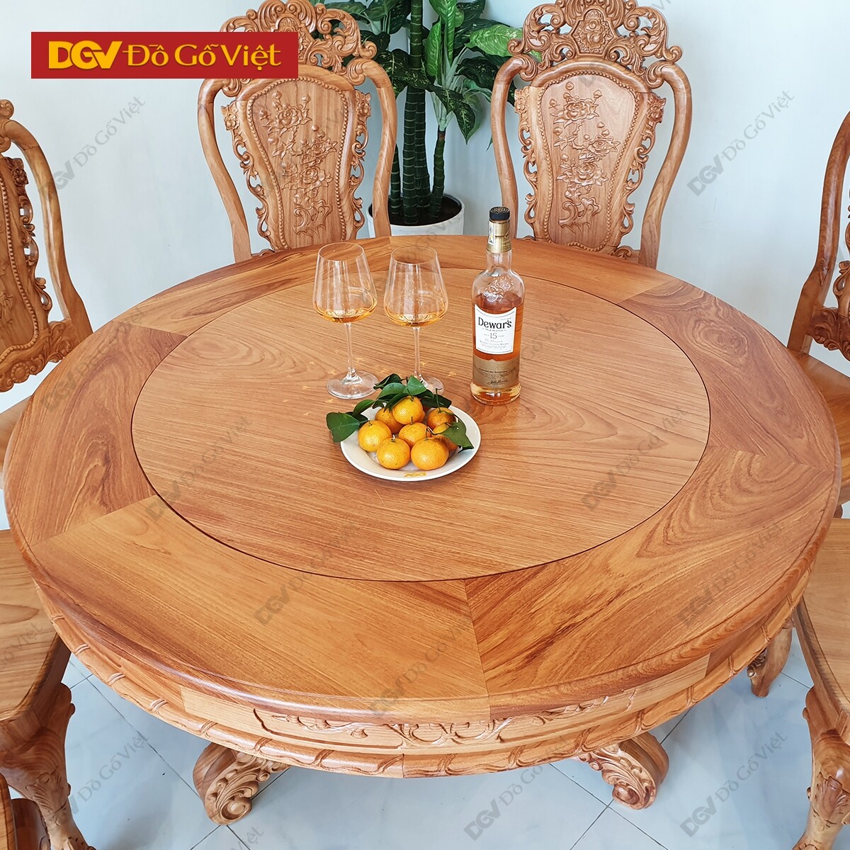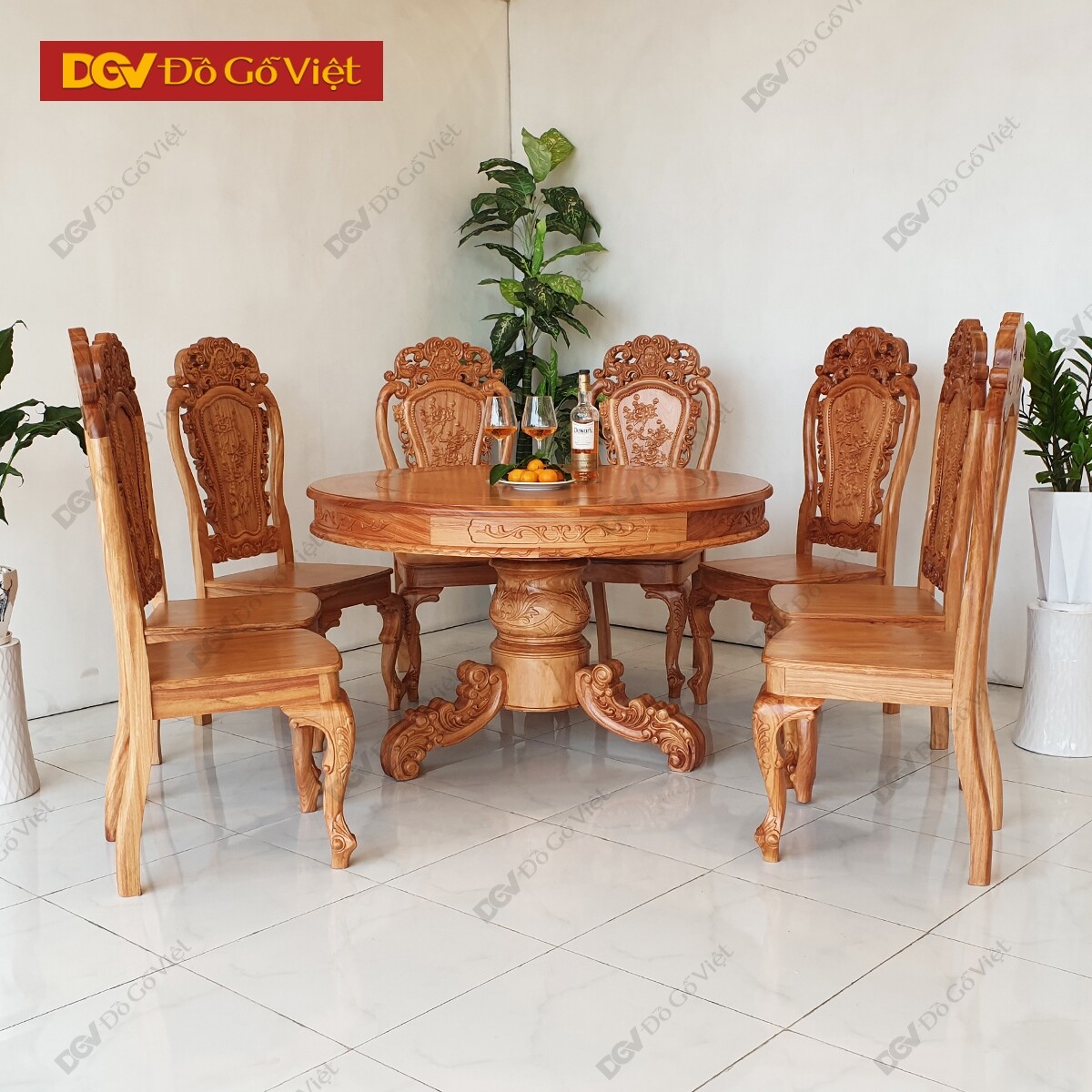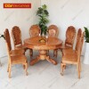 Bộ Bàn Ăn Tròn Chân Trụ Chạm To Gỗ Gõ Đỏ 100% Cao Cấp 8 Ghế