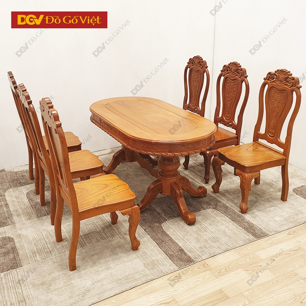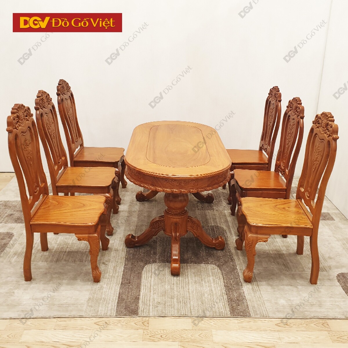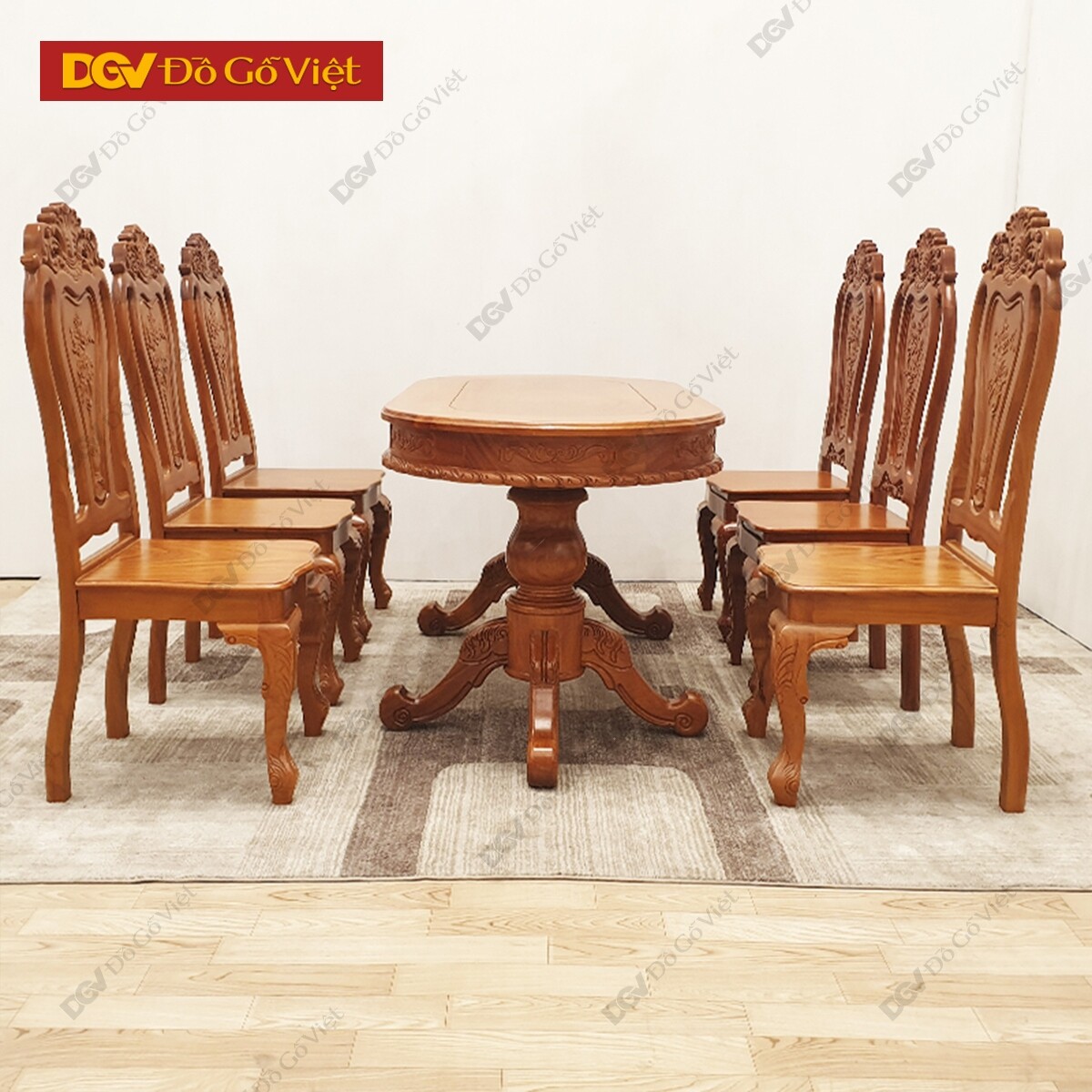 Bộ bàn ăn 6 ghế hoàn thiện trọn bộ gồm 1 bàn ăn + 6 ghế ngồi tiêu chuẩn. Bề mặt chạm trổ họa tiết và hoa văn tinh xảo như hoa hồng, hoa lan tây, hoa văn cuộn… biểu tượng đặc trưng riêng của phong cách nội thất hoàng gia châu Âu. Tất cả đều được chạy CNC tiêu chuẩn, chính xác đến từng mm, đảm bảo tính thẩm mỹ tốt nhất.