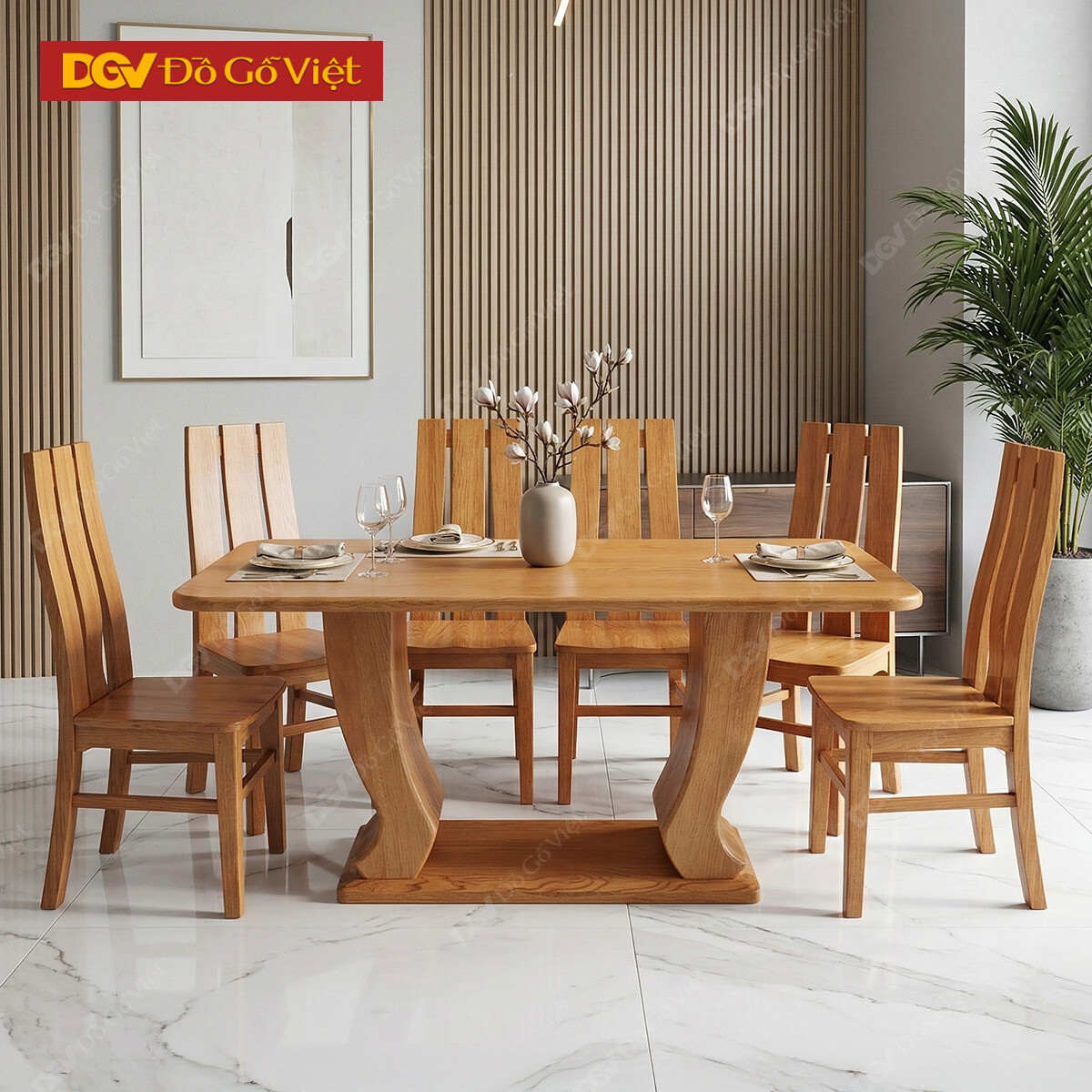 Bộ Bàn Ghế Phòng Ăn 6 Ghế Sồi Nga Chân Cong Màu Hương Vàng