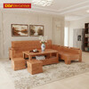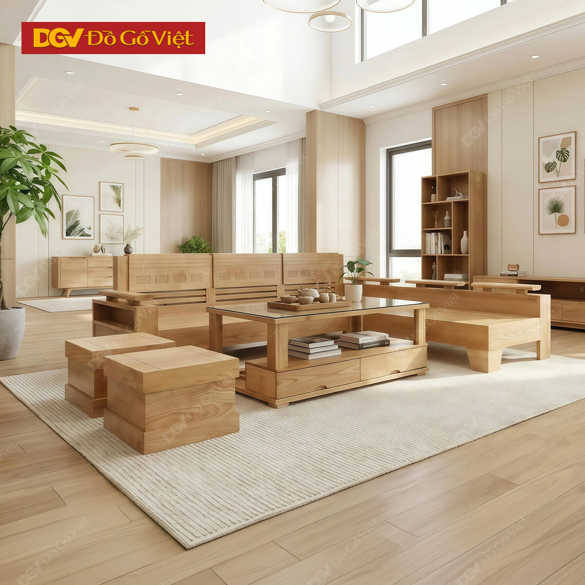 Là mẫu sofa gỗ sồi kiểu góc, bộ bàn ghế gỗ sồi nhắm tới sự tối ưu không gian, tiết kiệm diện tích giúp gian phòng khách rộng rãi và thoải mái hơn. Bàn hình chữ nhật chân thấp với họa tiết nan vuông không cầu kỳ kết hợp hộc tủ nhỏ tinh tế là nơi để các vật dụng nhỏ như ly, tách, khay trà,...