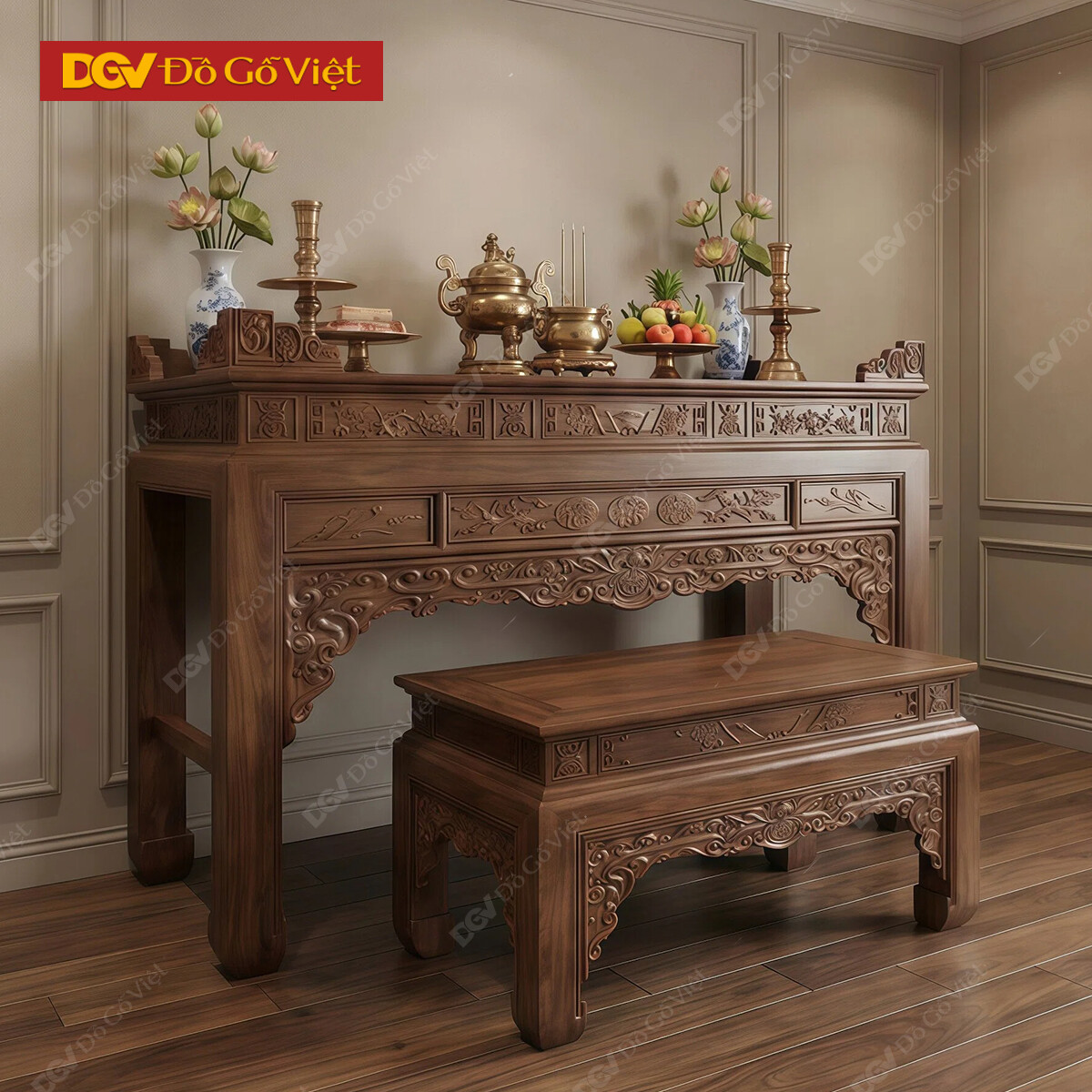 Bộ Bàn Thờ Gia Tiên Gỗ Căm Xe Việt Bề Thế Điêu Khắc Tinh Xảo