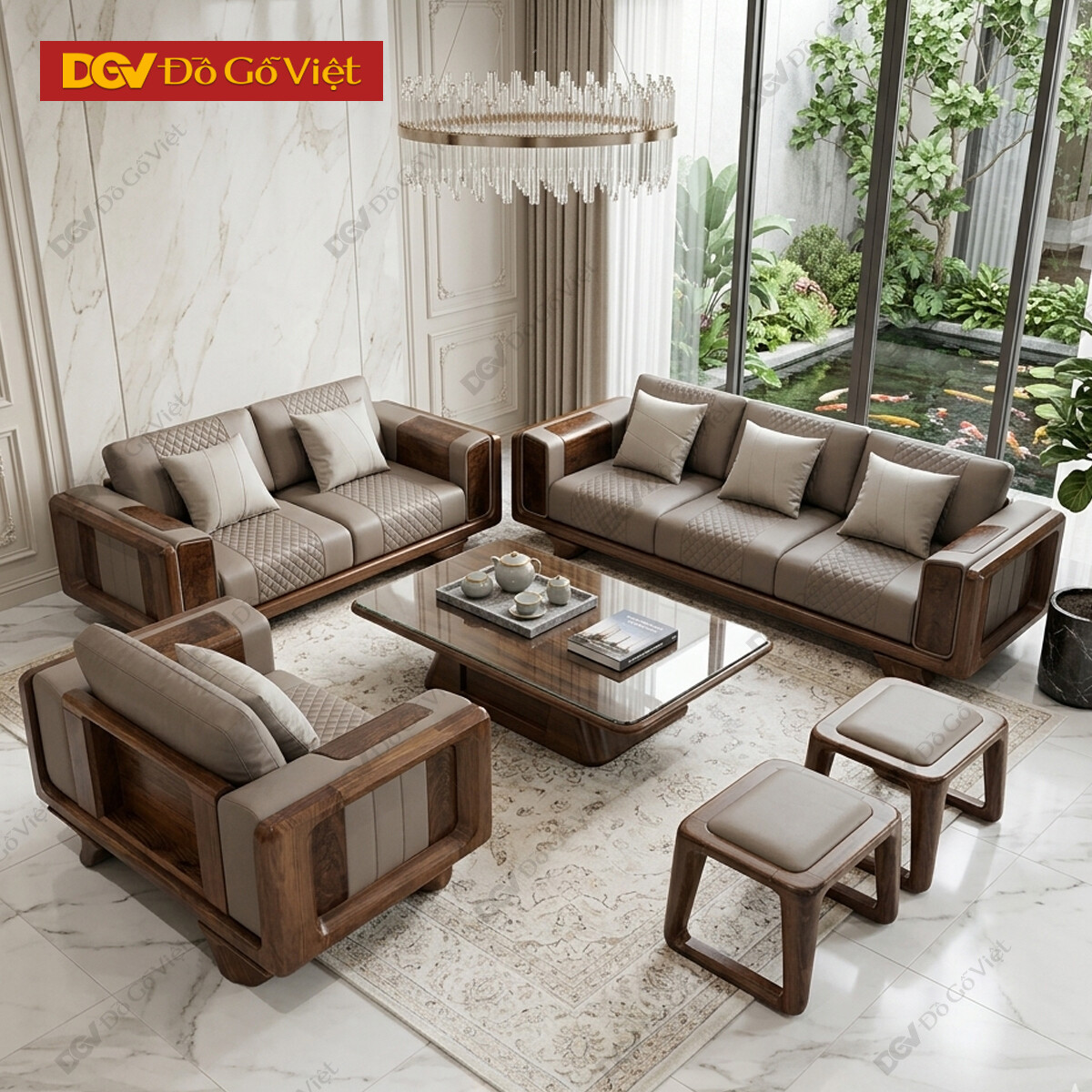 Bộ Sofa Phòng Khách Gỗ Óc Chó Tay Nan Cách Điệu Nghệ Thuật