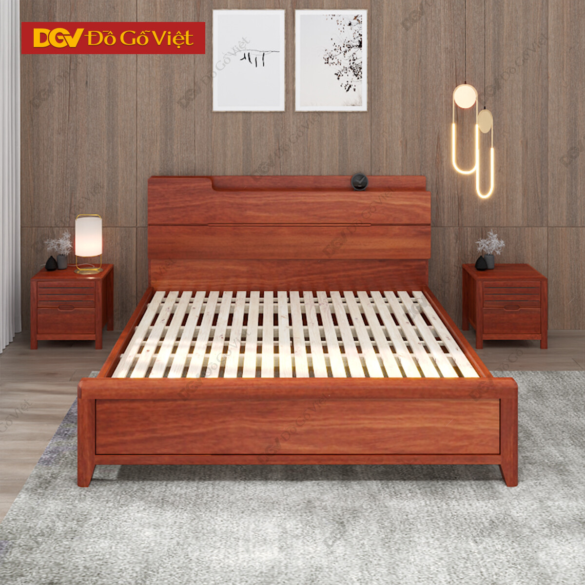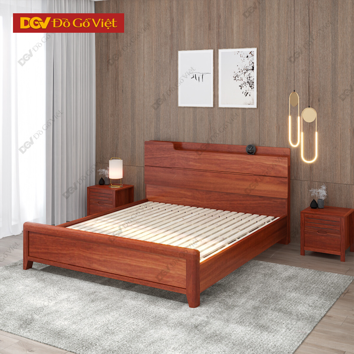 Giường Ngủ Gỗ Căm Xe Tự Nhiên Với Kệ Đầu Giường Tiện Ích
