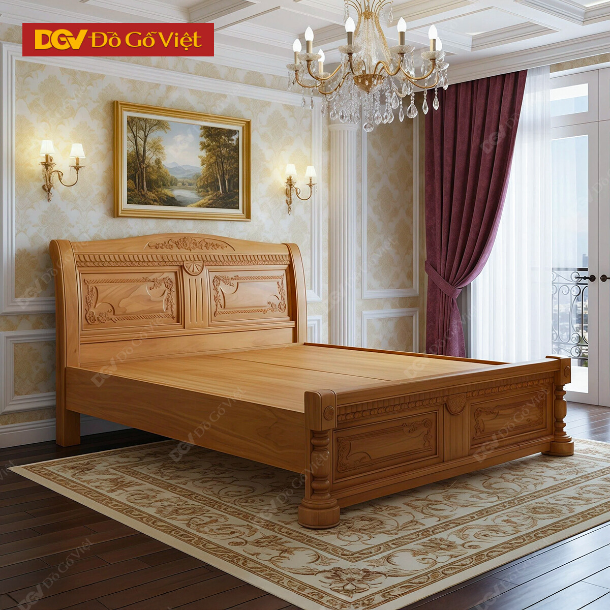 Giường Ngủ Gỗ Đỏ Veneer Khung Pano Chạm Hoa Văn Nổi Bật
