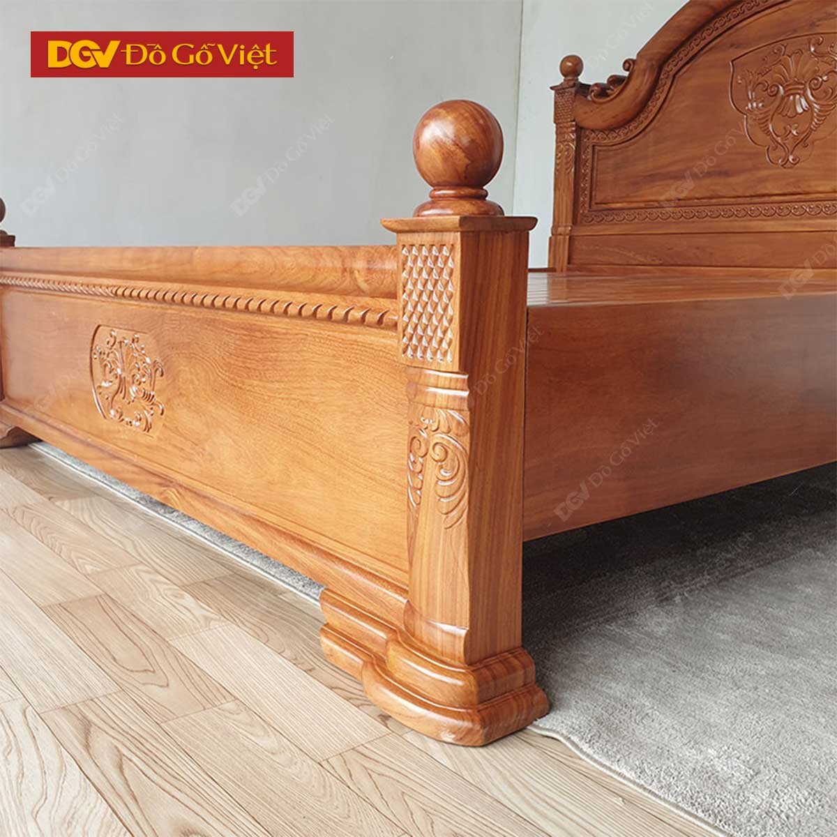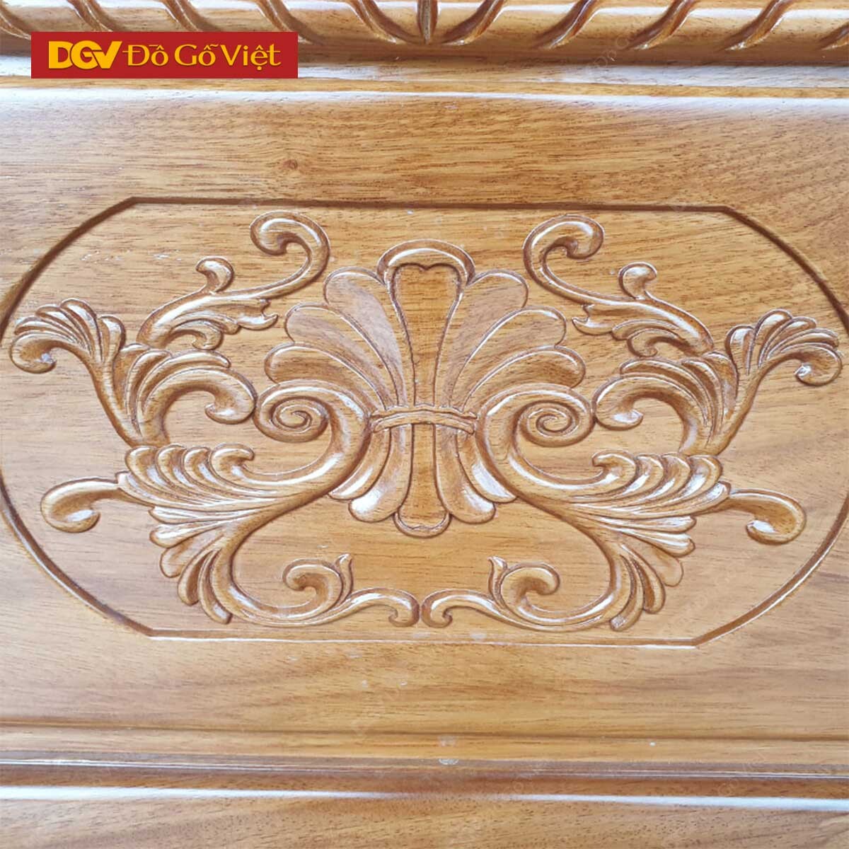 Vai giường thiết kế dày 3cm với những tấm gỗ lớn nguyên tấm được gắn mộc chắc chắn đảm bảo tính kết nối vững chắc cho đầu và đuôi giường. Vai giường được lựa chọn từ những tấm gỗ có vân đẹp nhất để đảm bảo dù không đục chạm vẫn có nét đẹp và tính thẩm mỹ riêng.