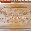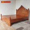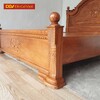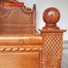 Đầu giường ngủ gỗ gõ đỏ chạm nổi hoa văn lan tây với các chi tiết được cuộn tròn, cách điệu cầu kỳ nổi bật trên chất liệu gỗ. Bên ngoài là đường viền uốn lượn tạo thành hình dạng huy hiệu hoàng gia vô cùng sáng tạo. Thiết kế chân trụ chạm hình thoi với phần đỉnh được triện tròn đẹp đậm chất hoàng gia châu Âu.