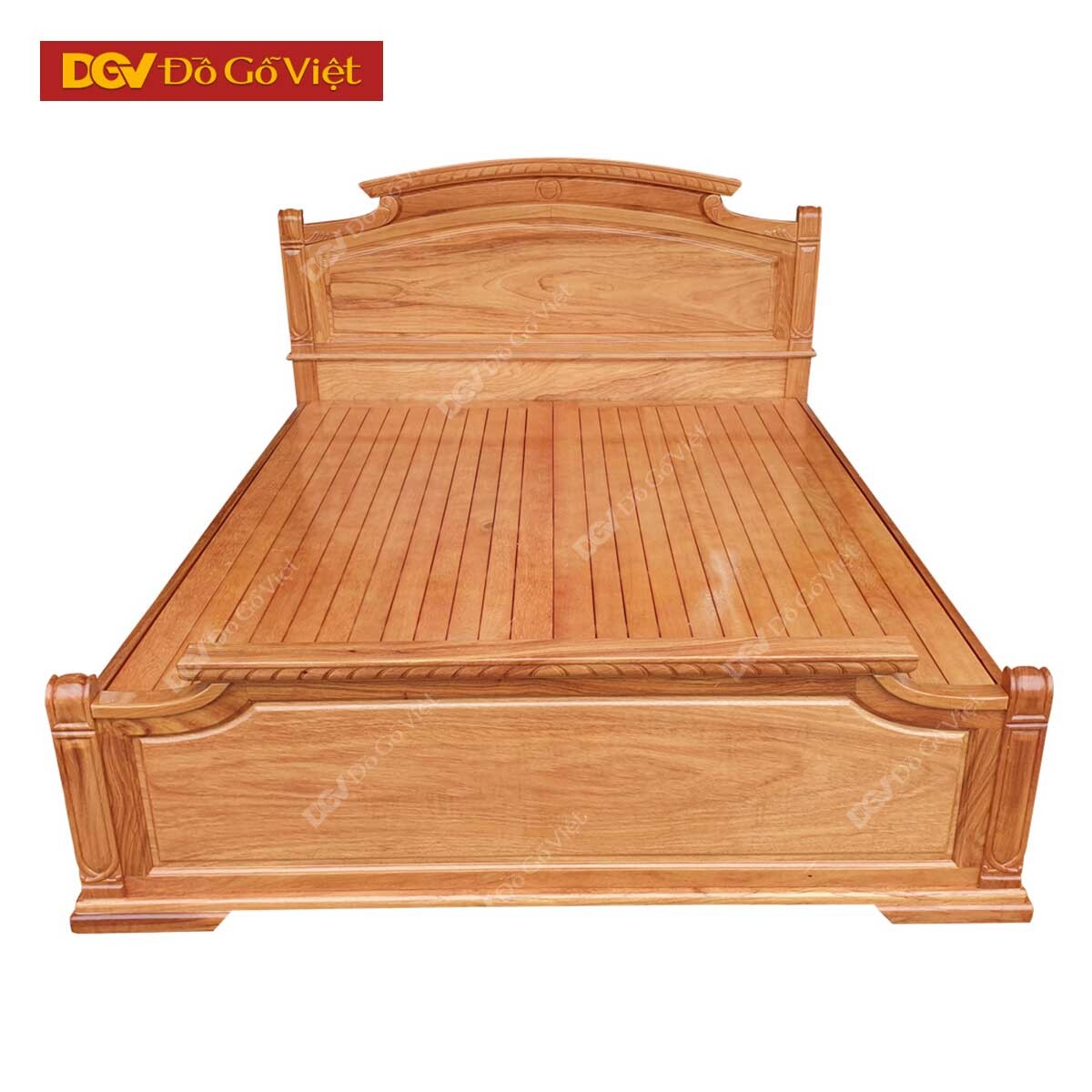 Khung giường được hoàn thiện từ gỗ gõ đỏ chất lượng tốt, chống lại được các ảnh hưởng xấu từ môi trường và thời tiết như mối mọt, cong vênh, ẩm mốc,... Bên ngoài sản phẩm được phủ lên một lớp sơn PU để giúp sản phẩm luôn sáng bóng và sử dụng được lâu dài.