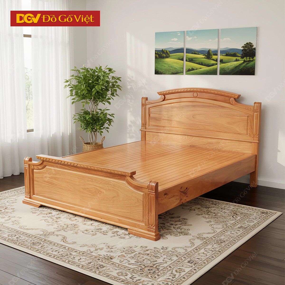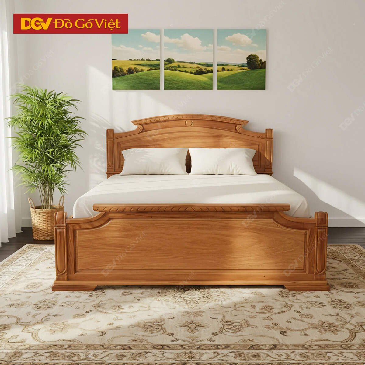 Mẫu giường ngủ chất liệu gỗ tự nhiên này được thiết kế mang đậm chất truyền thống với hoa văn trang trí kiểu dáng rẻ quạt được thiết kế đối xứng tạo cho người sử dụng cảm giác hài hòa ở nhiều góc nhìn. Phần đỉnh giường được nâng cao và thon dài sang hai bên, uốn lượn nhẹ nhàng dọc theo phần khung giường mềm mại đầy tính nghệ thuật.