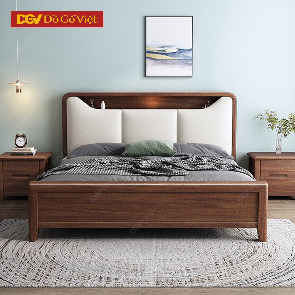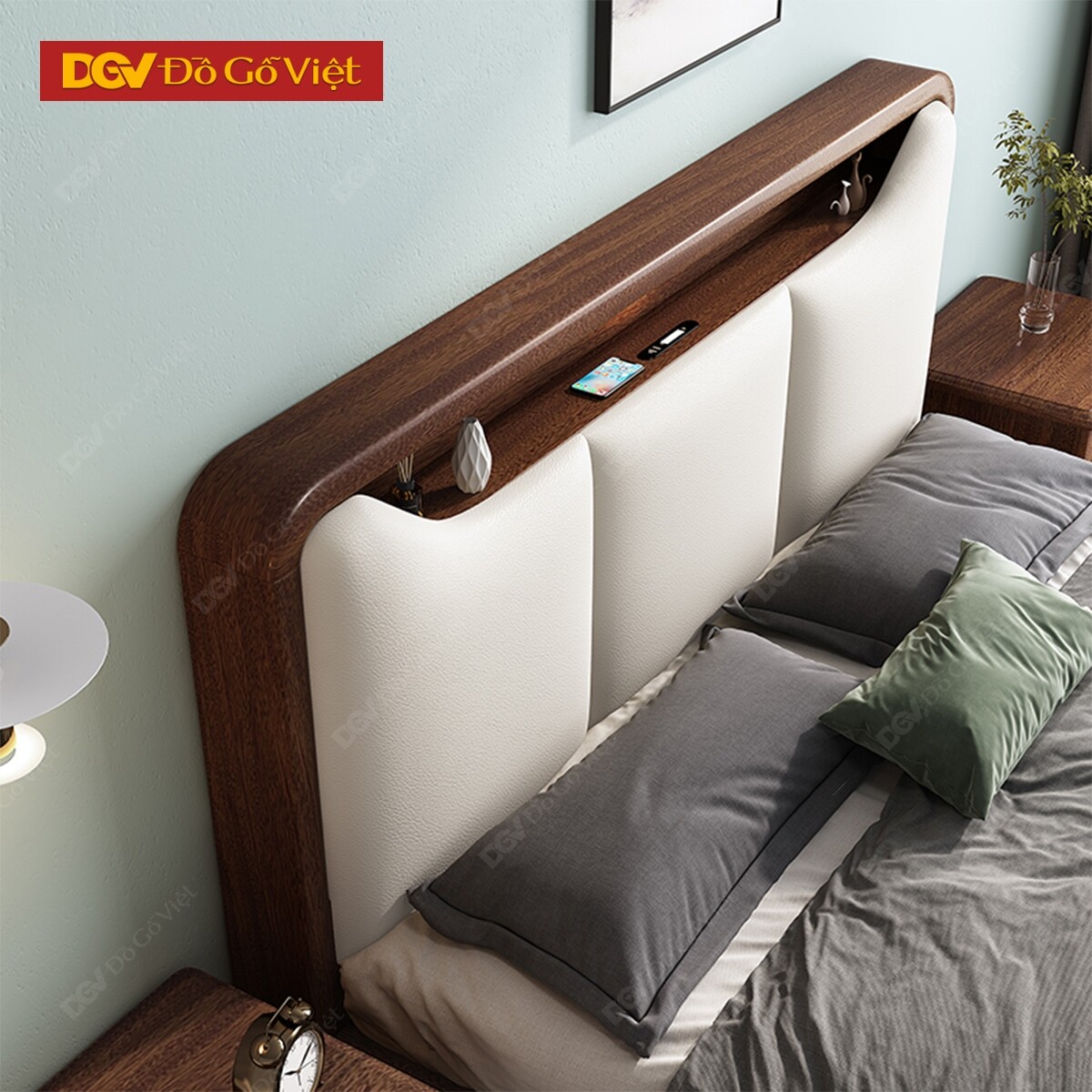 Giường Ngủ Gỗ Veneer Óc Chó Đầu Bọc Nệm Kèm Kệ Tiện Nghi