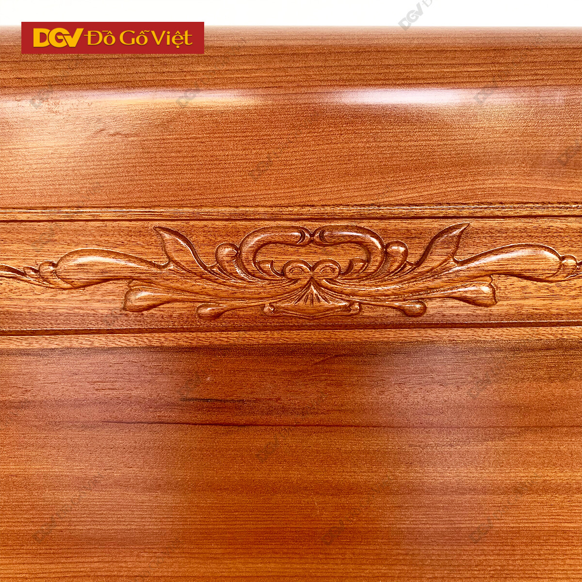 Họa tiết 5 dòng kẻ đối xứng cùng hoa lá theo phong cách cổ điển được chạm khắc ở đỉnh giường và đuôi giường mềm mại, nhẹ nhàng. Hoa văn họa tiết được chạm nổi trên sản phẩm kết hợp với vẻ đẹp của chất liệu gỗ là sự kết hợp hoàn hảo của tính nhân tạo và chất tự nhiên độc đáo nhất.