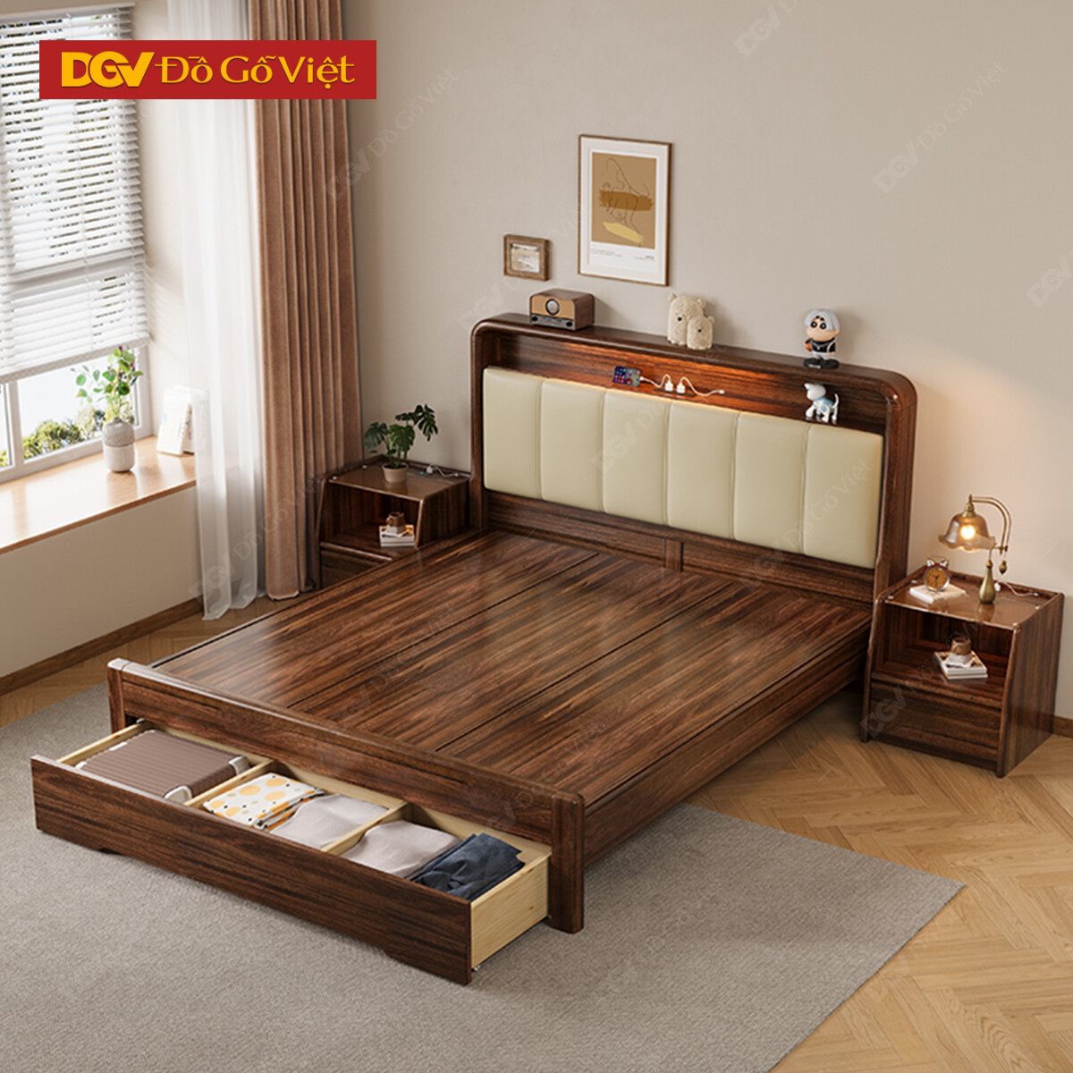 Giường Ngủ Veneer Óc Chó Hiện Đại Tích Hợp Kệ Và Ngăn Kéo