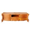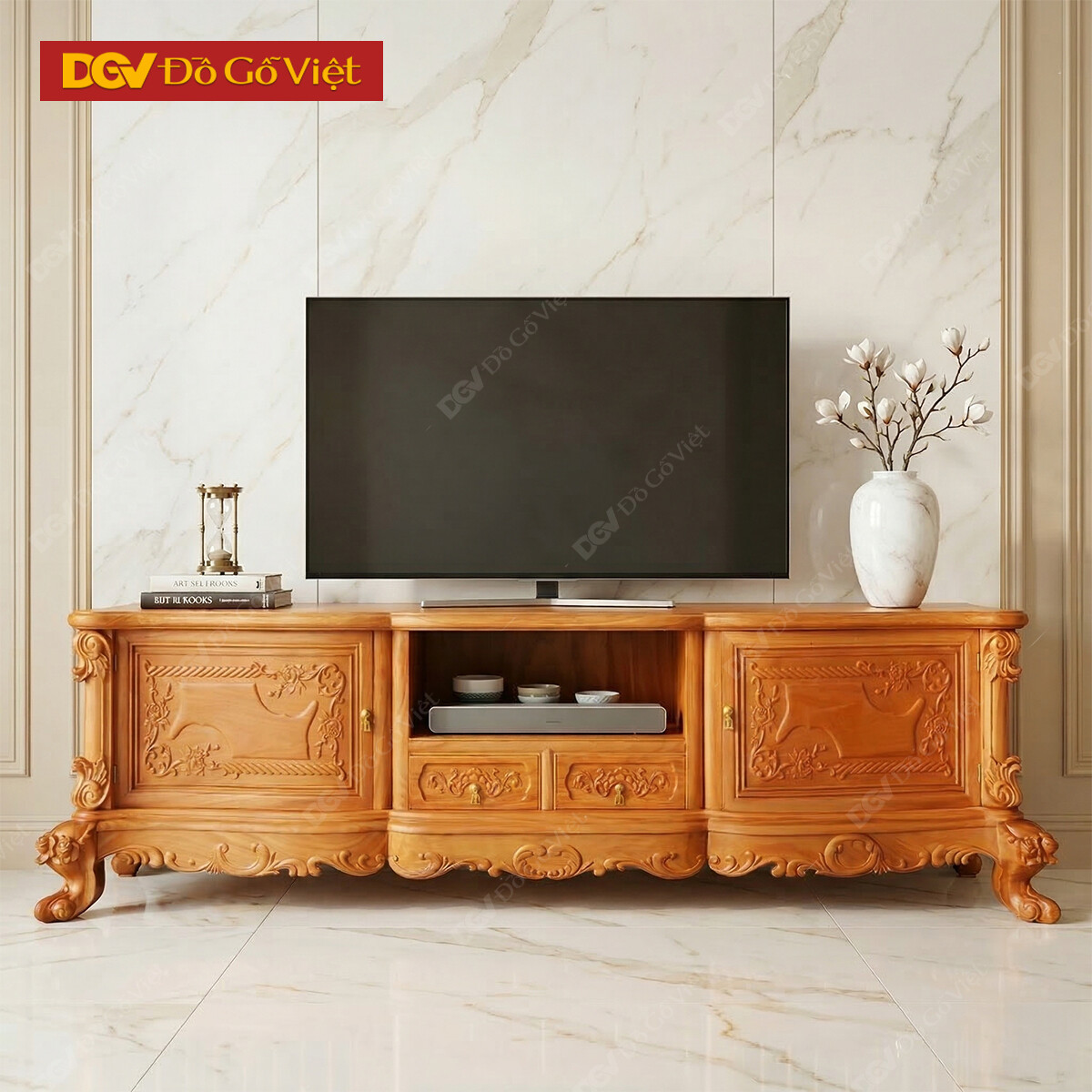 Kệ tivi sở hữu kiểu dáng khối hộp được ghép nối từ các tấm gỗ, thanh gỗ rắn chắc tạo nên khả năng chịu lực tuyệt vời. Tưởng chừng như vẻ ngoài mang hình khối sẽ khiến tủ tivi trở nên thô cứng, khô khan, nhưng nhờ sự khéo léo của các nghệ nhân, sản phẩm trở nên mềm mại, trang nhã hơn bởi các đường cong, uốn lượn, bo tròn ở khắp các góc cạnh.