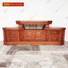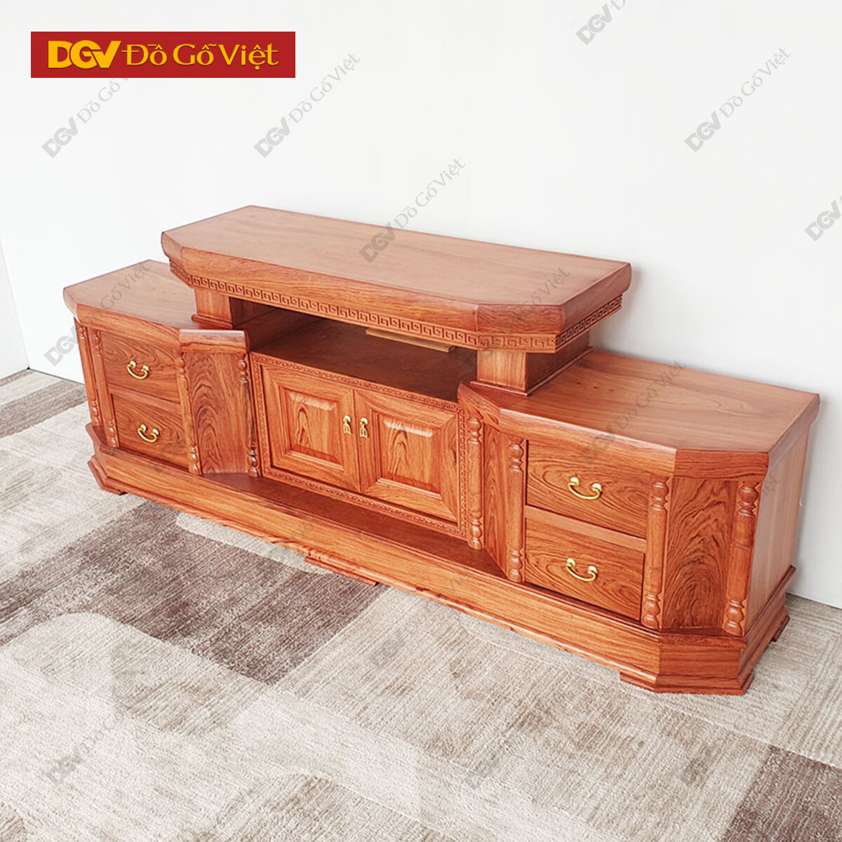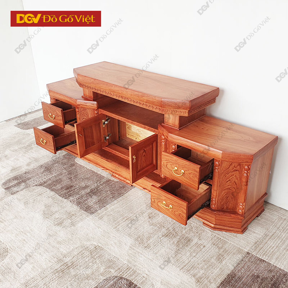 Tạo hình kệ tivi được chạm đục tỉ mỉ đến từng chi tiết đường nét, họa tiết pano kết hợp các đường viền hoa văn uốn lượn uyển chuyển mềm mại đối xứng mang đến vẻ đẹp cân đối, nhẹ nhàng, hài hòa ở nhiều góc nhìn.