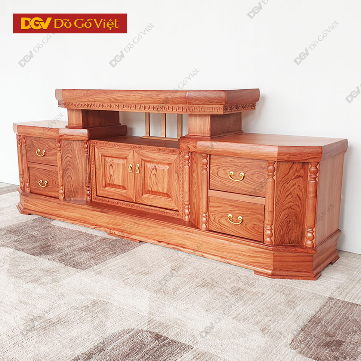 Kệ tivi 2 tầng gỗ hương đá được chế tác với kiểu dáng hình khối hộp trang nhã, các chi tiết được sử dụng gỗ nguyên tấm nâng cao độ chắc chắn, an toàn tạo cho khách hàng sự an tâm trong quá trình sử dụng.