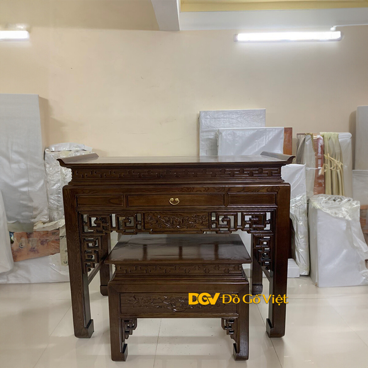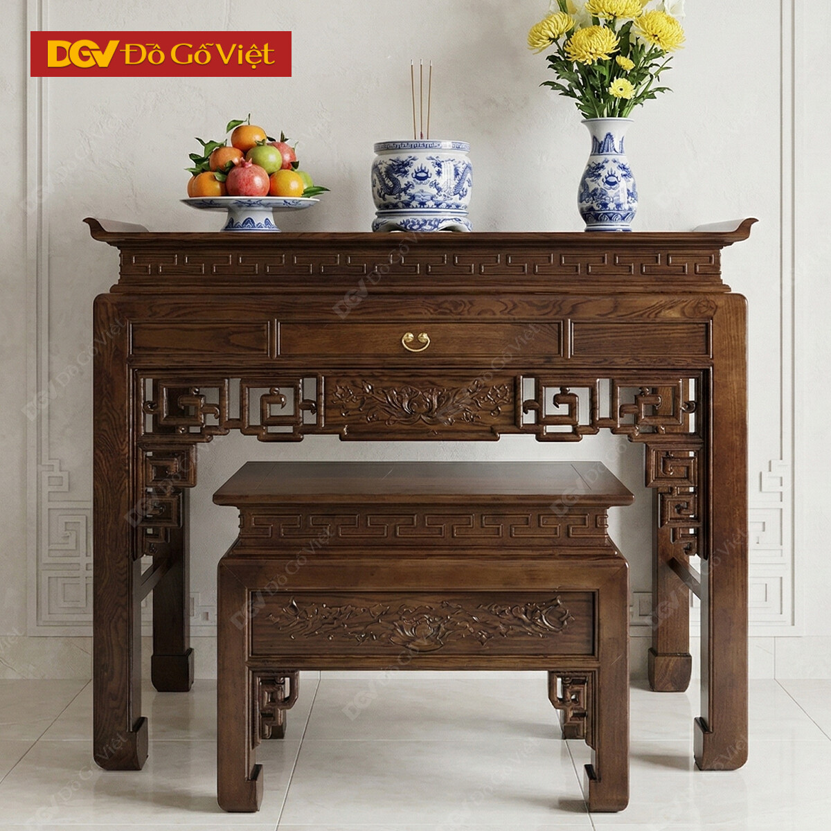 Mẫu Án Thờ Gỗ Sồi Đẹp Chạm Họa Tiết Hoa Sen Nở Tinh Tế