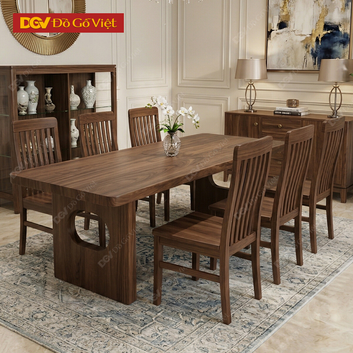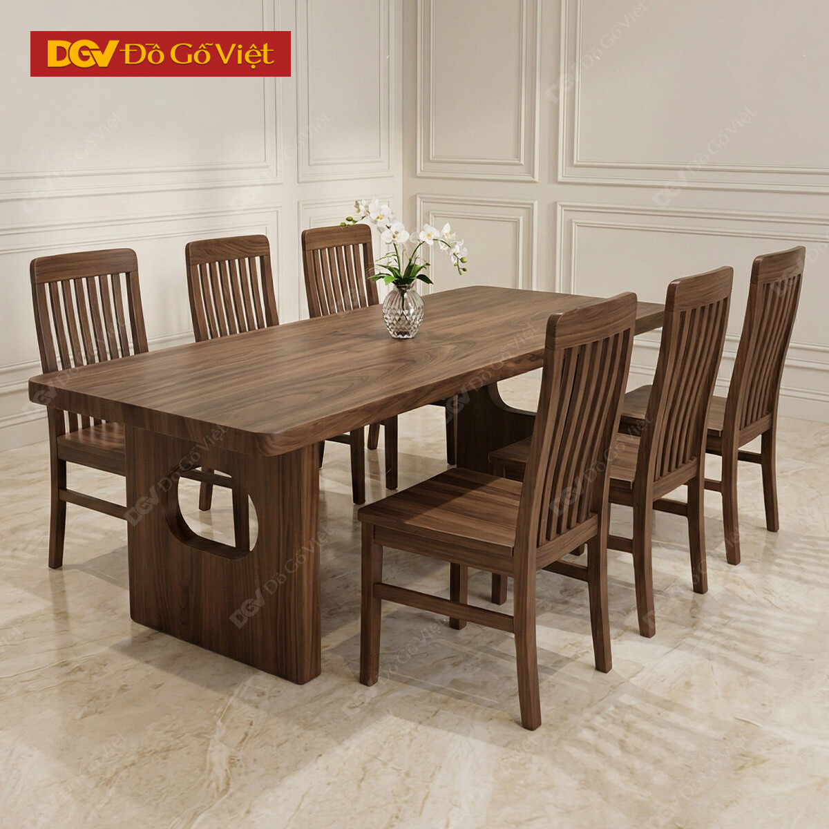 Mẫu Bàn Ghế Ăn Gỗ Óc Chó 6 Ghế Chân Phong Cách Nhật Tối Giản
