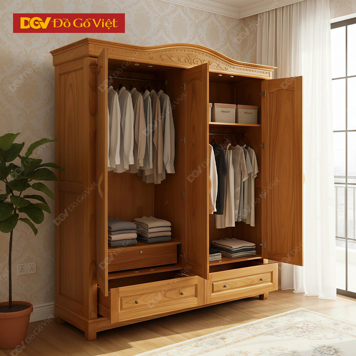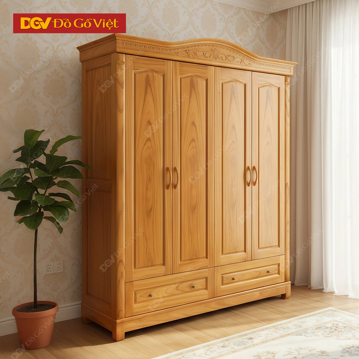 Mẫu Tủ Áo Gỗ Gõ Đỏ Mẫu Vòm 4 Cánh Trơn Kèm Ngăn Kéo Ngoài