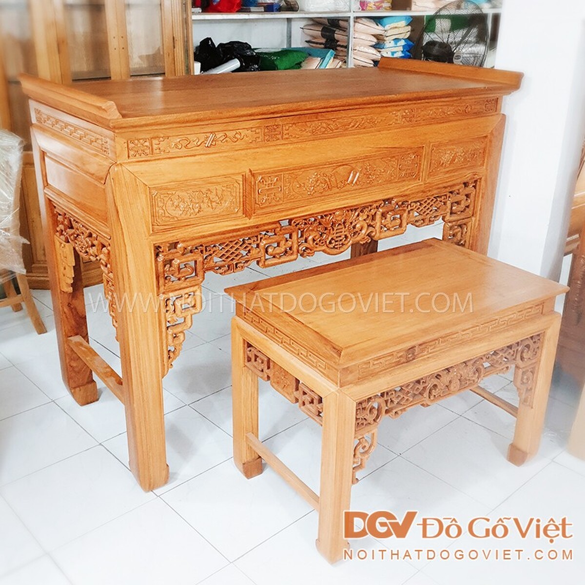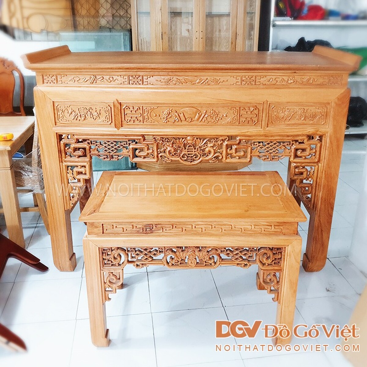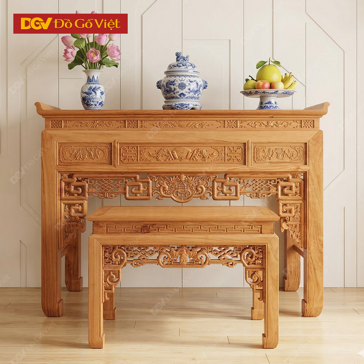 Bao quanh các họa tiết trên là tổng thể khối hộp mạnh mẽ với các đường nét góc cạnh, mặt bàn chữ nhật bằng phẳng, chân trụ nguyên khối rắn chắc không những khiến sản phẩm vững chãi, chắc chắn hơn mà còn giúp gia chủ dễ dàng bày trí, sử dụng hơn trong thờ cúng hằng ngày.