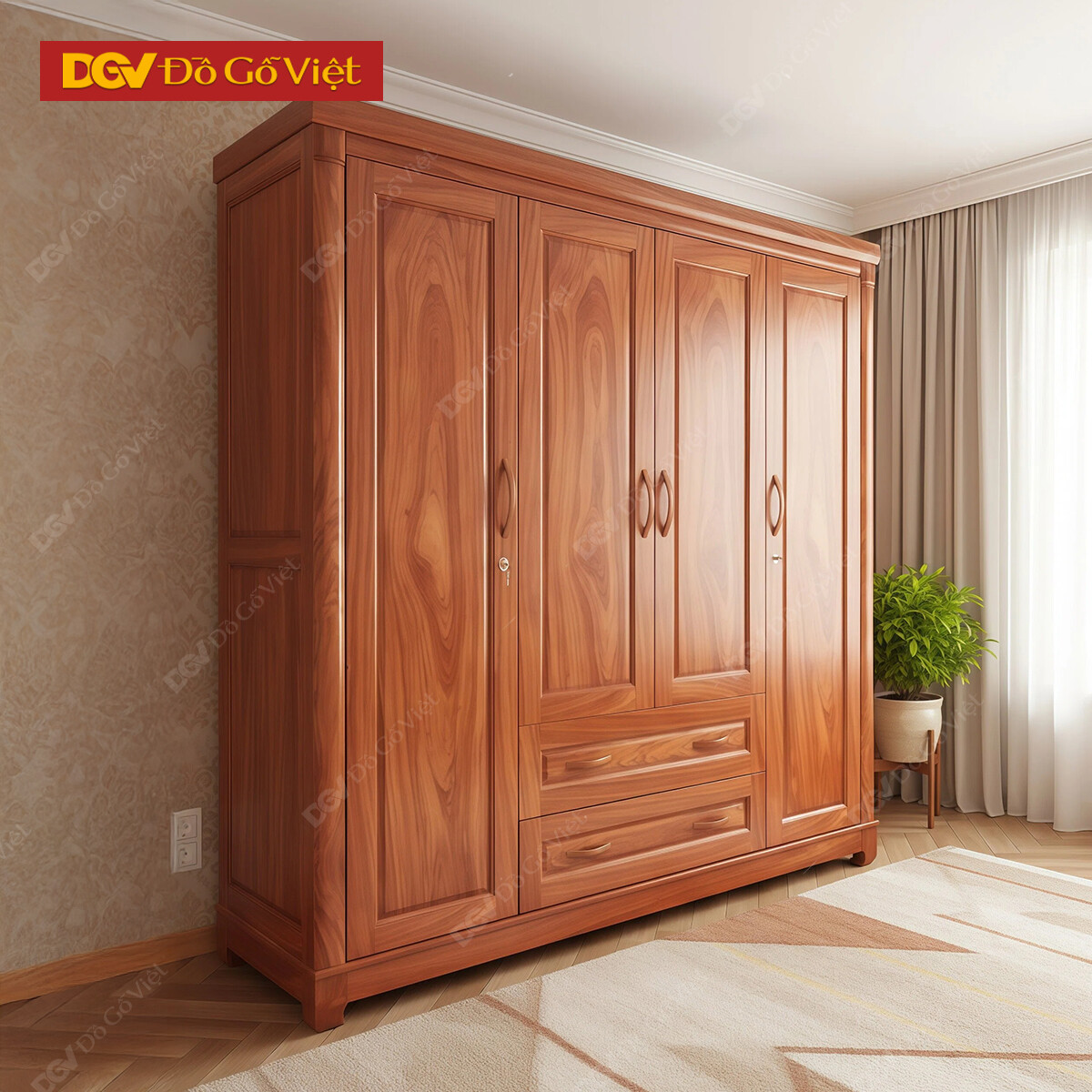 Tủ Quần Áo 4 Cánh Gỗ Veneer Hương Đá Pano Cong Đẹp Bền