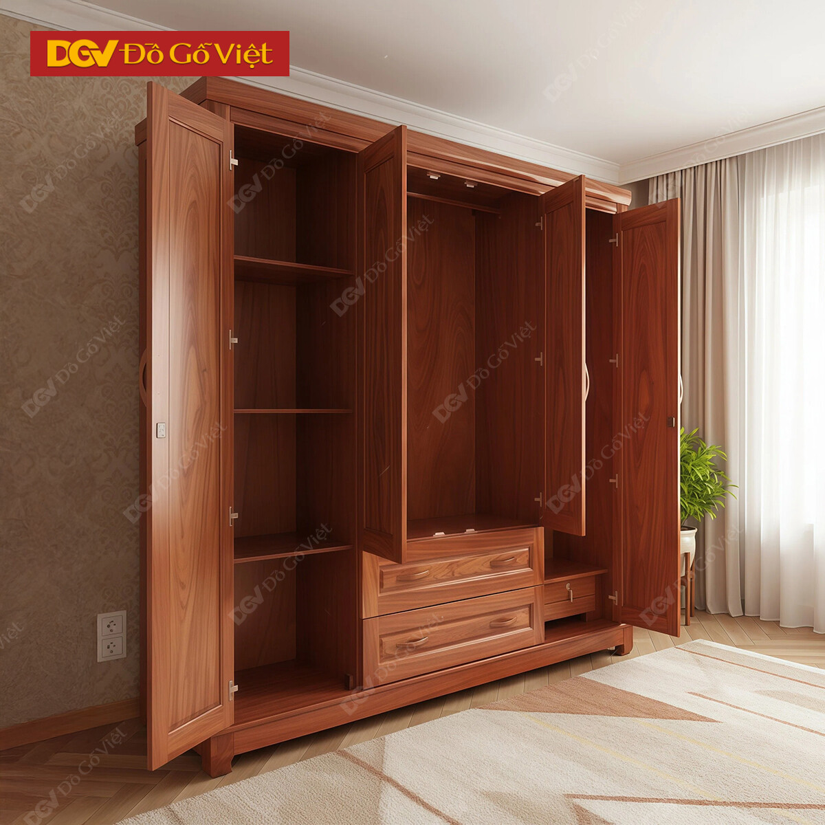 Mẫu Tủ Áo Gỗ Tự Nhiên 5 Cánh Vân Hương Đá Đẹp Sang Trọng