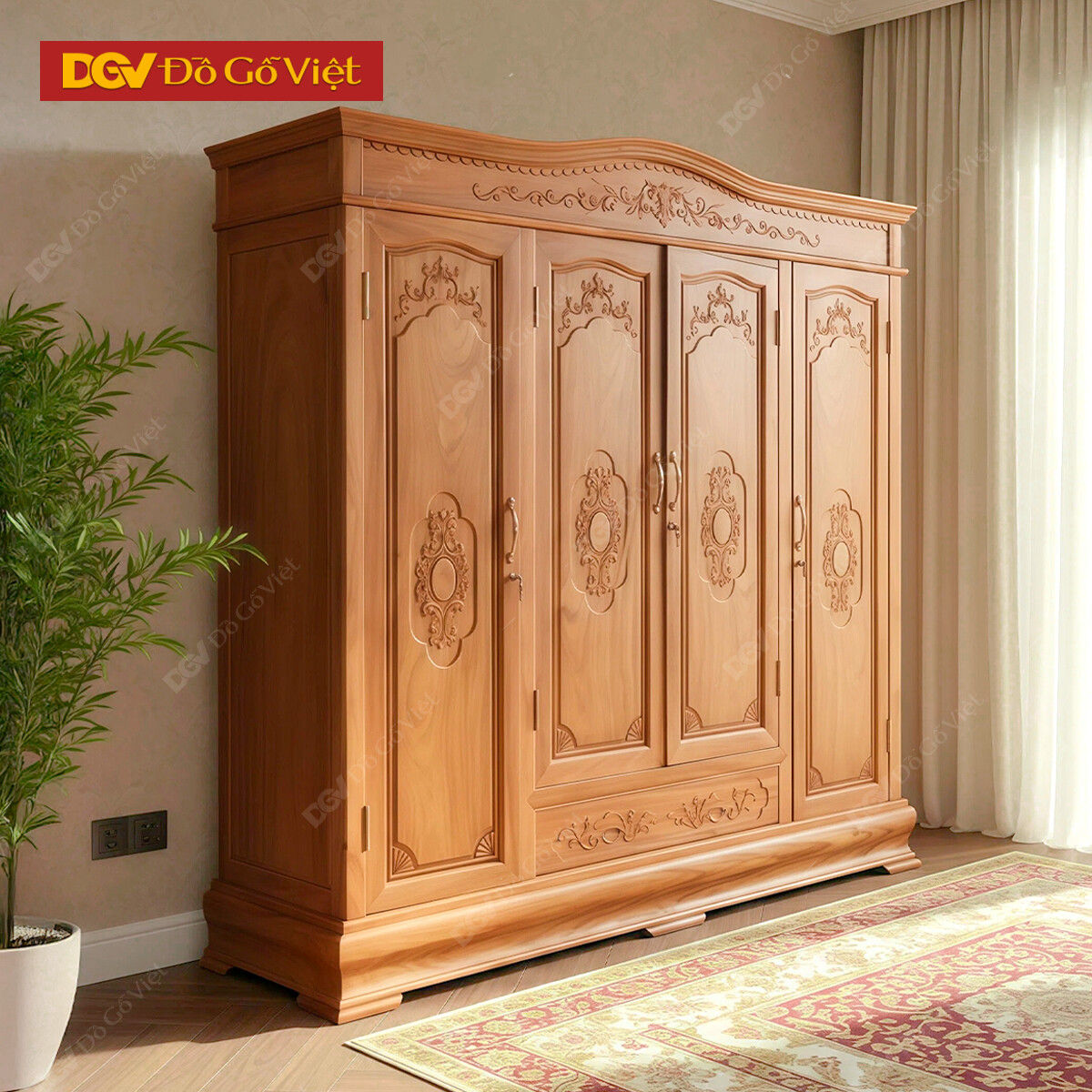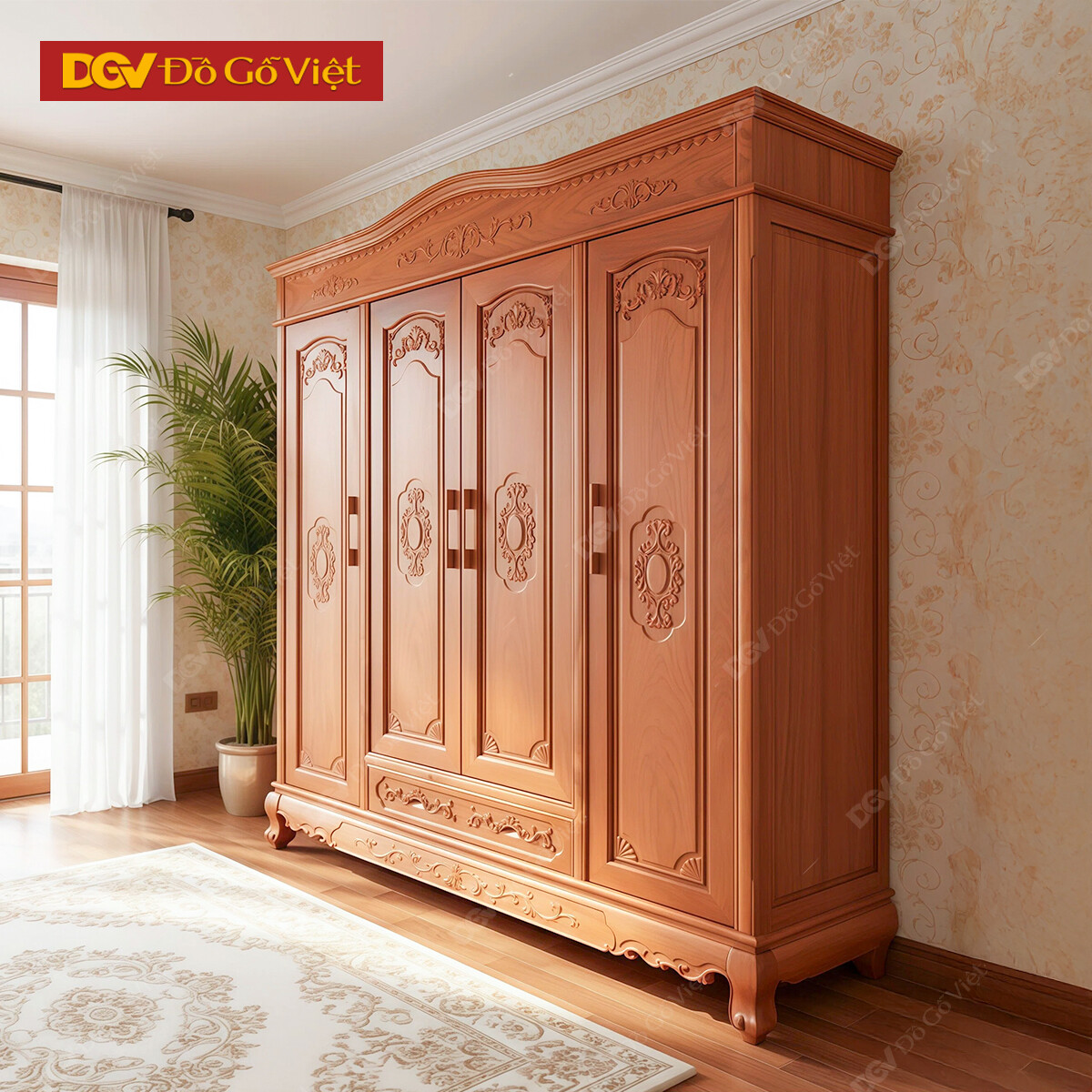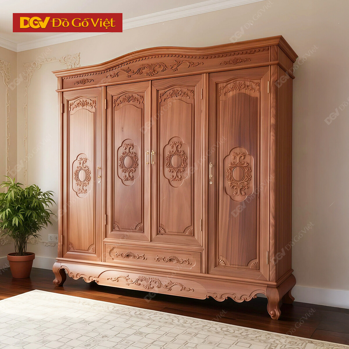 Mẫu Tủ Áo Gỗ Gõ Đỏ Mẫu Vòm 4 Cánh Trơn Kèm Ngăn Kéo Ngoài