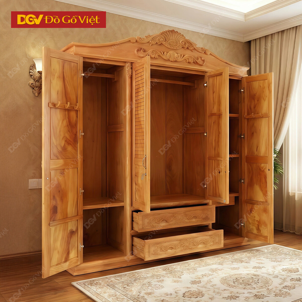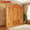 Tủ Gỗ Quần Áo 4 Cánh Pano Vân Gõ Đỏ Kết Hợp Kệ Trang Trí
