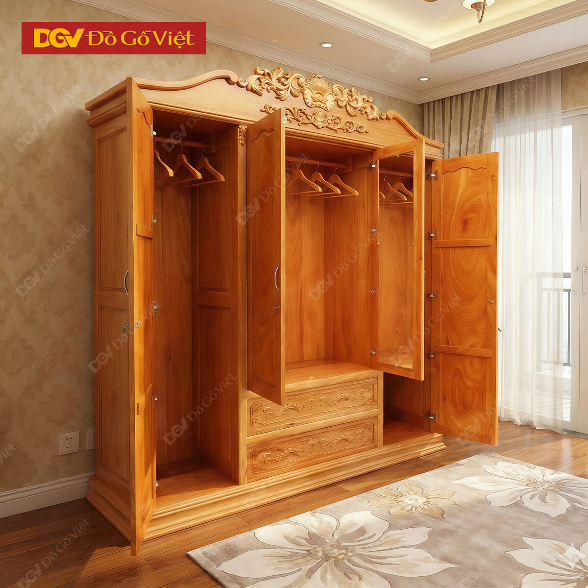 Tủ Quần Áo Gõ Đỏ Cao Cấp 4 Cánh Mở