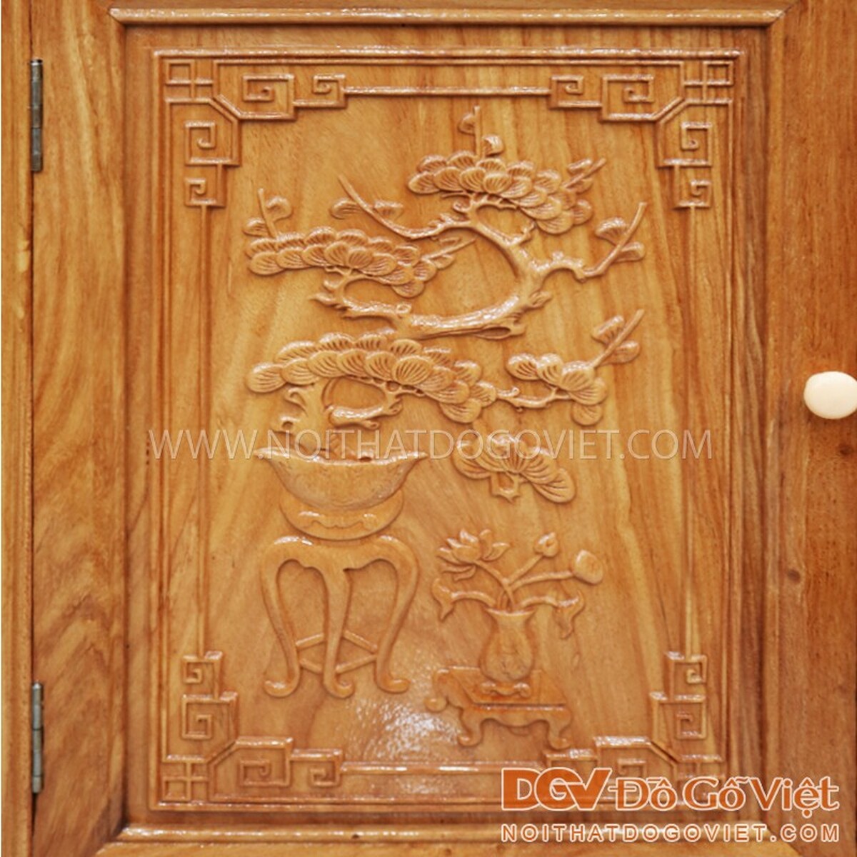 • Đỉnh tủ chạm đường viền hình chữ Vạn tượng trưng cho mặt trời, biểu tượng của điềm lành, may mắn, sự thanh tịnh và bình an. Mặt cánh tủ chạm họa tiết hoa nở tứ quý, đại diện cho 4 mùa, biểu thị cho sự hoàn hảo, hoàn mỹ, thể hiện mong ước của con người về sự bình an, sung túc, hạnh phúc, đuề huề.