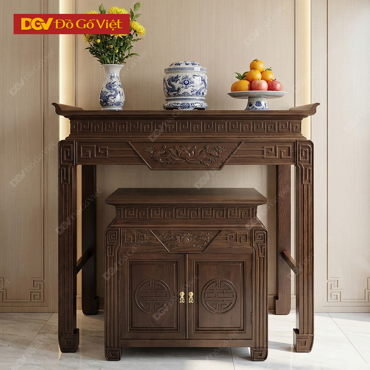 Án Gian Phòng Thờ Gỗ Sồi Giá Rẻ Chạm Họa Tiết Hoa Sen Đẹp